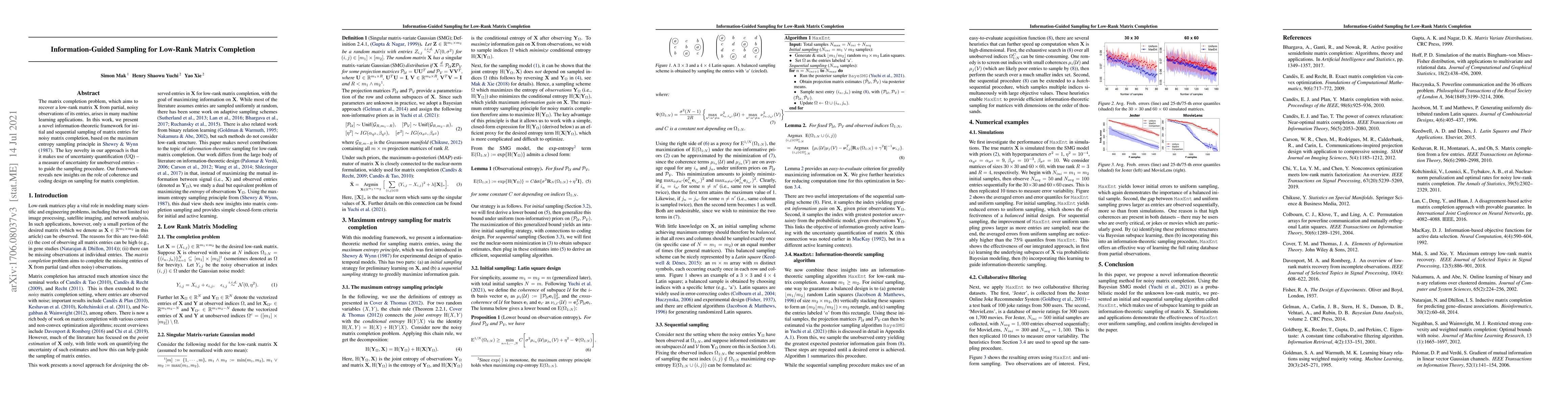 The noisy matrix completion problem, which aims to recover a low-rank matrix $\mathbf{X}$ from a partial, noisy observation of its entries, arises in many statistical, machine learning, and engineering applications. In this paper, we present a new, information-theoretic approach for active sampling (or designing) of matrix entries for noisy matrix completion, based on the maximum entropy design principle. One novelty of our method is that it implicitly makes use of uncertainty quantification (UQ) -- a measure of uncertainty for unobserved matrix entries -- to guide the active sampling procedure. The proposed framework reveals several novel insights on the role of compressive sensing (e.g., coherence) and coding design (e.g., Latin squares) on the sampling performance and UQ for noisy matrix completion. Using such insights, we develop an efficient posterior sampler for UQ, which is then used to guide a closed-form sampling scheme for matrix entries. Finally, we illustrate the effectiveness of this integrated sampling / UQ methodology in simulation studies and two applications to collaborative filtering.