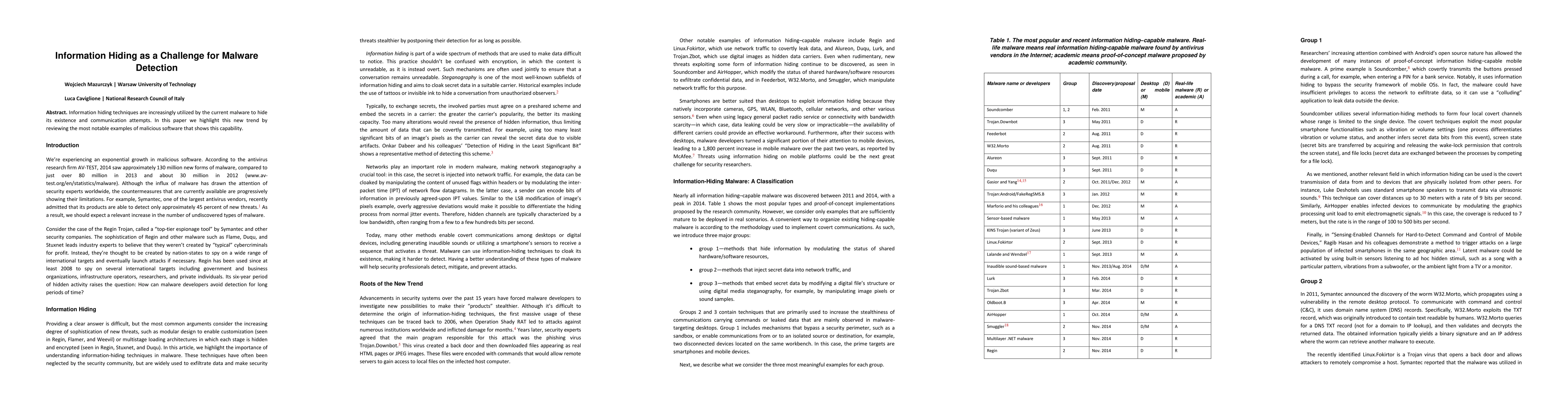 Summary: This paper reviews how modern malware employs sophisticated information hiding techniques to evade detection, highlighting notable examples of such malicious software. The study emphasizes the growing challenge these methods pose for traditional malware detection systems.