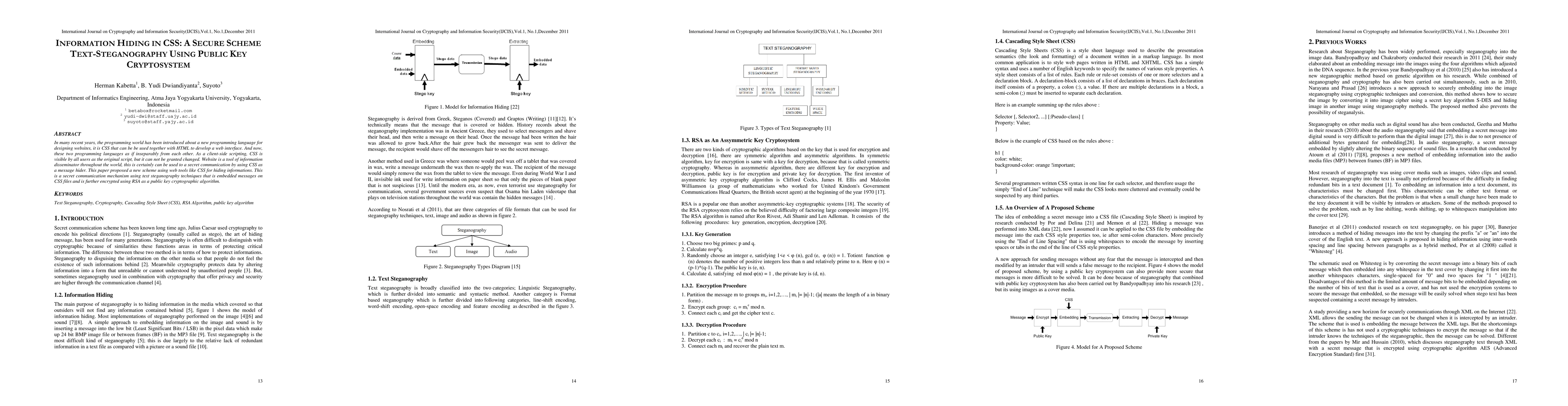 A new secure scheme using CSS for text steganography with RSA encryption offers a method for secret communication through website development. It embeds messages in CSS files and encrypts them to protect information hiding.