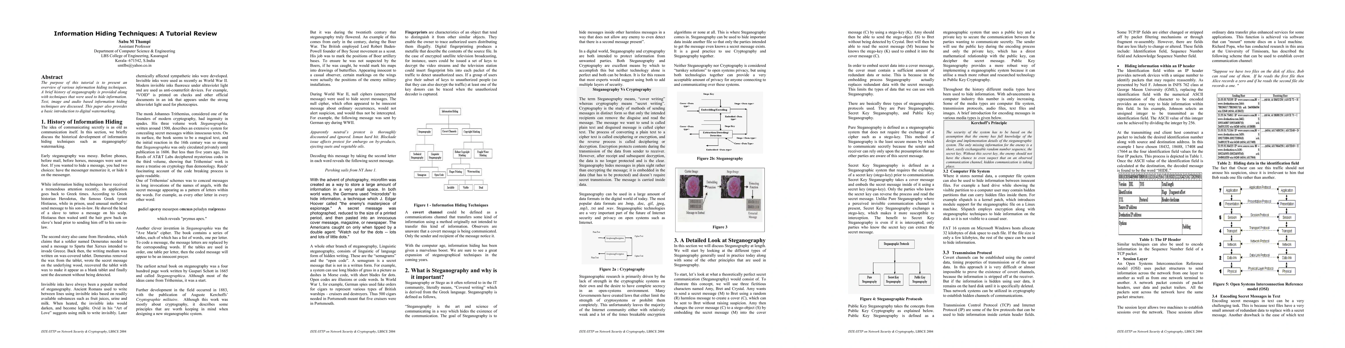 The purpose of this tutorial is to present an overview of various information hiding techniques. A brief history of steganography is provided along with techniques that were used to hide information. Text, image and audio based information hiding techniques are discussed. This paper also provides a basic introduction to digital watermarking.