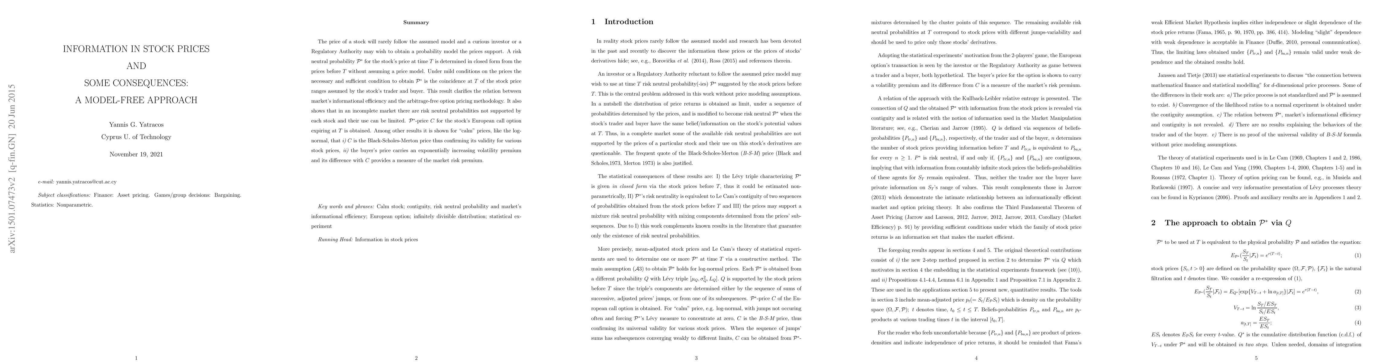 The price of a stock will rarely follow the assumed model and a curious investor or a Regulatory Authority may wish to obtain a probability model the prices support. A risk neutral probability ${\cal P}^*$ for the stock's price at time $T$ is determined in closed form from the prices before $T$ without assuming a price model. The findings indicate that ${\cal P}^*$ may be a mixture. Under mild conditions on the prices the necessary and sufficient condition to obtain ${\cal P}^*$ is the coincidence at $T$ of the stock price ranges assumed by the stock's trader and buyer. This result clarifies the relation between market's informational efficiency and the arbitrage-free option pricing methodology. It also shows that in an incomplete market there are risk neutral probabilities not supported by each stock and their use can be limited. ${\cal P}^*$-price $C$ for the stock's European call option expiring at $T$ is obtained. Among other results it is shown for "calm" prices, like the log-normal, that i) $C$ is the Black-Scholes-Merton price thus confirming its validity for various stock prices, ii) the buyer's price carries an exponentially increasing volatility premium and its difference with $C$ provides a measure of the market risk premium.