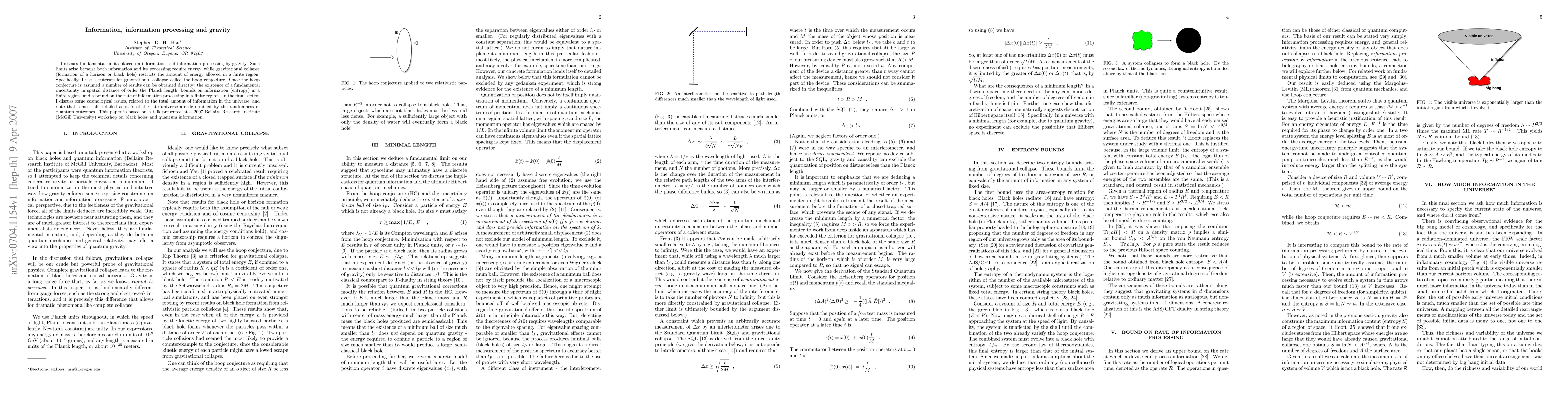 I discuss fundamental limits placed on information and information processing by gravity. Such limits arise because both information and its processing require energy, while gravitational collapse (formation of a horizon or black hole) restricts the amount of energy allowed in a finite region. Specifically, I use a criterion for gravitational collapse called the hoop conjecture. Once the hoop conjecture is assumed a number of results can be obtained directly: the existence of a fundamental uncertainty in spatial distance of order the Planck length, bounds on information (entropy) in a finite region, and a bound on the rate of information processing in a finite region. In the final section I discuss some cosmological issues related to the total amount of information in the universe, and note that almost all detailed aspects of the late universe are determined by the randomness of quantum outcomes. This paper is based on a talk presented at a 2007 Bellairs Research Institute (McGill University) workshop on black holes and quantum information.