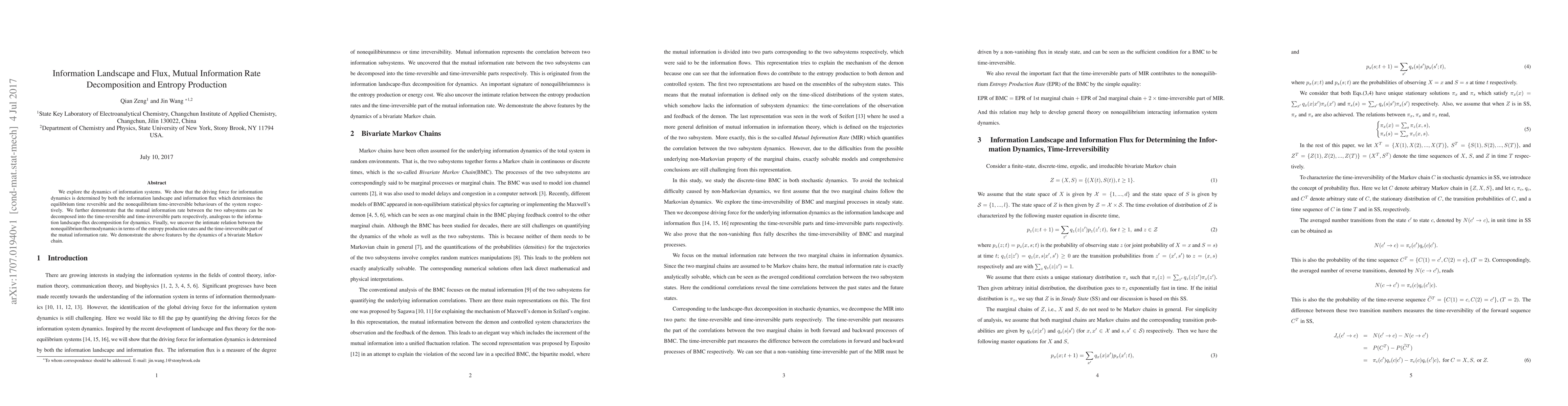 This paper investigates the dynamics of information systems, revealing that information landscape and flux drive equilibrium and nonequilibrium behaviors. It decomposes mutual information into reversible and irreversible parts, linking entropy production to the irreversible mutual information component through a bivariate Markov chain.