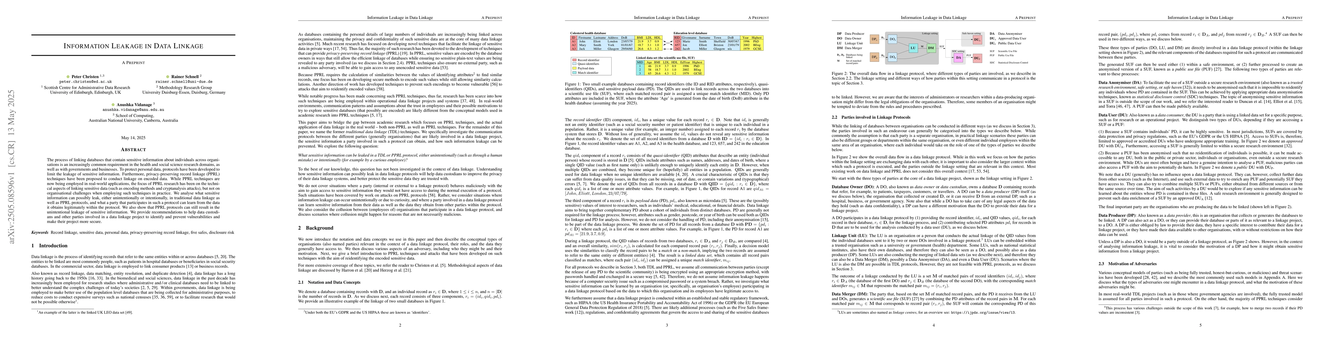 The paper analyzes sensitive information leakage in traditional data linkage and privacy-preserving record linkage (PPRL) protocols, focusing on organizational challenges rather than technical aspects.
