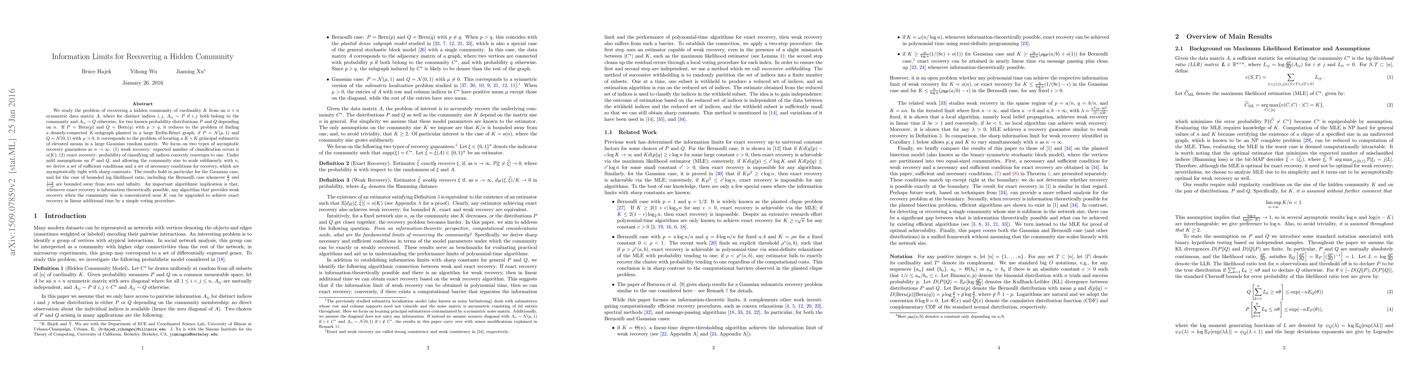 The paper studies the problem of recovering a hidden community of cardinality $K$ from an $n \times n$ symmetric data matrix $A$, using asymptotic recovery guarantees as $n \to \infty$. It explores both weak recovery (expected number of classification errors $o(K)$) and exact recovery (probability of classifying all indices correctly converging to one).