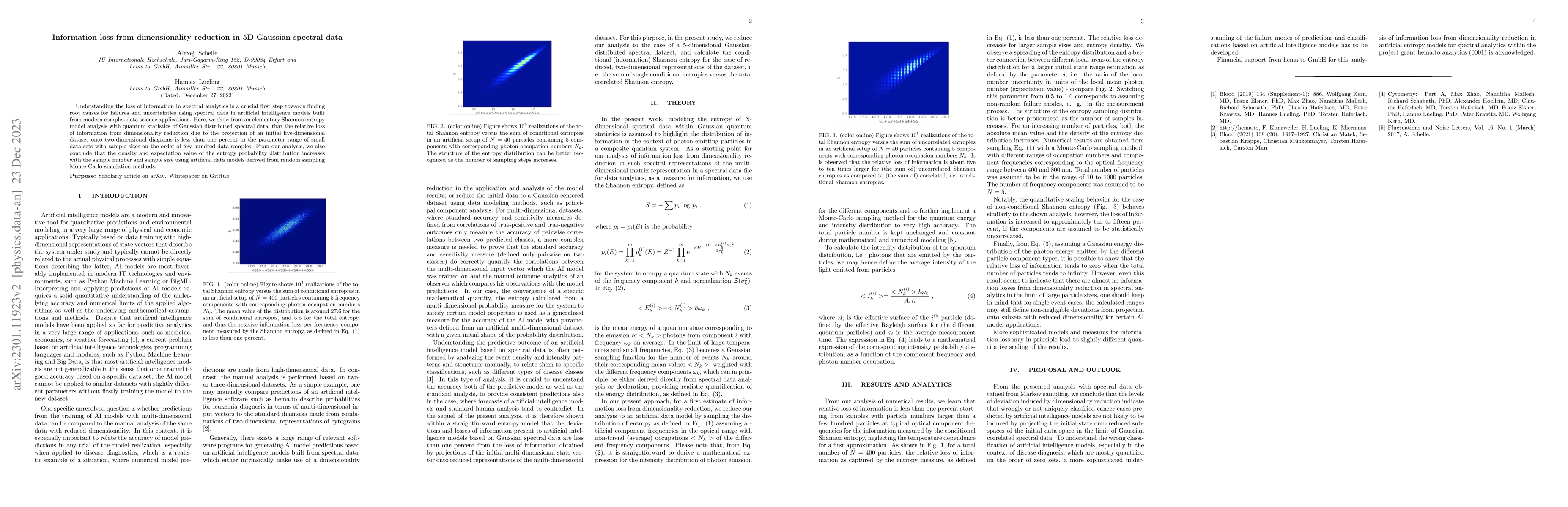 Understanding the loss of information in spectral analytics is a crucial first step towards finding root causes for failures and uncertainties using spectral data in artificial intelligence models built from modern complex data science applications. Here, we show from an elementary Shannon entropy model analysis with quantum statistics of Gaussian distributed spectral data, that the relative loss of information from dimensionality reduction due to the projection of an initial five-dimensional dataset onto two-dimensional diagrams is less than one percent in the parameter range of small data sets with sample sizes on the order of few hundred data samples. From our analysis, we also conclude that the density and expectation value of the entropy probability distribution increases with the sample number and sample size using artificial data models derived from random sampling Monte Carlo simulation methods.