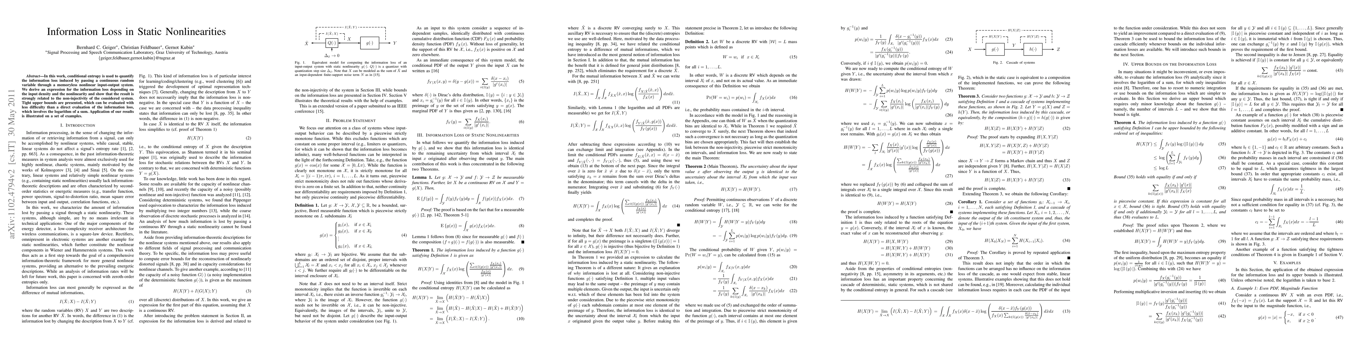 This paper quantifies information loss in static nonlinearities using conditional entropy, deriving an expression that relates loss to the input density and system non-injectivity. It provides tighter upper bounds for easier evaluation compared to direct computation, and demonstrates applications through examples.