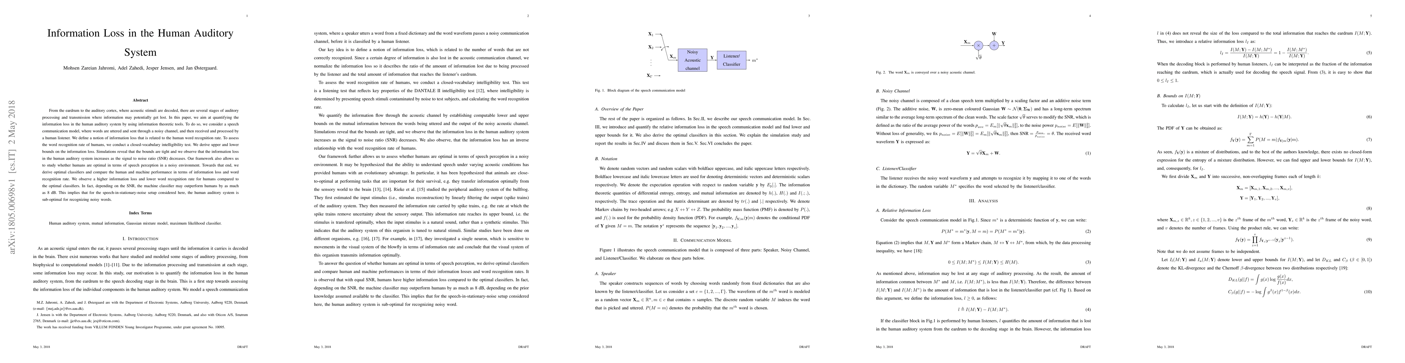 This paper quantifies information loss in the human auditory system using information theory, finding that it increases with lower signal-to-noise ratios. It reveals that humans are sub-optimal compared to optimal classifiers, which can outperform humans by up to 8 dB in noisy environments.