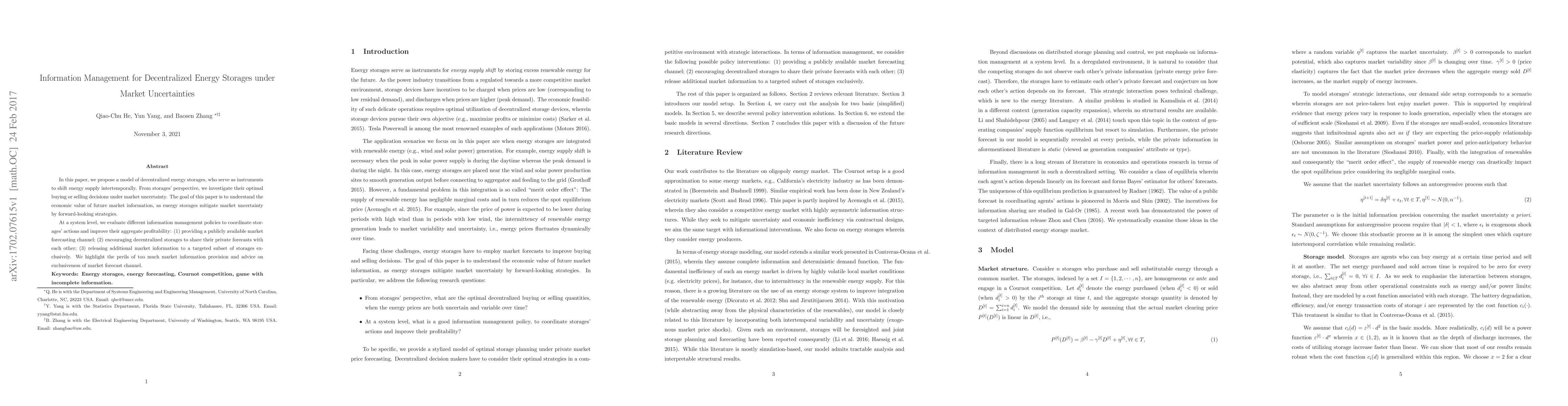 This paper models decentralized energy storages' optimal buying/selling decisions under market uncertainty and evaluates information management policies to enhance their profitability, including public forecasts, shared private forecasts, and exclusive information release. It warns against over-provision of market information and advocates for the selective distribution of forecasts.