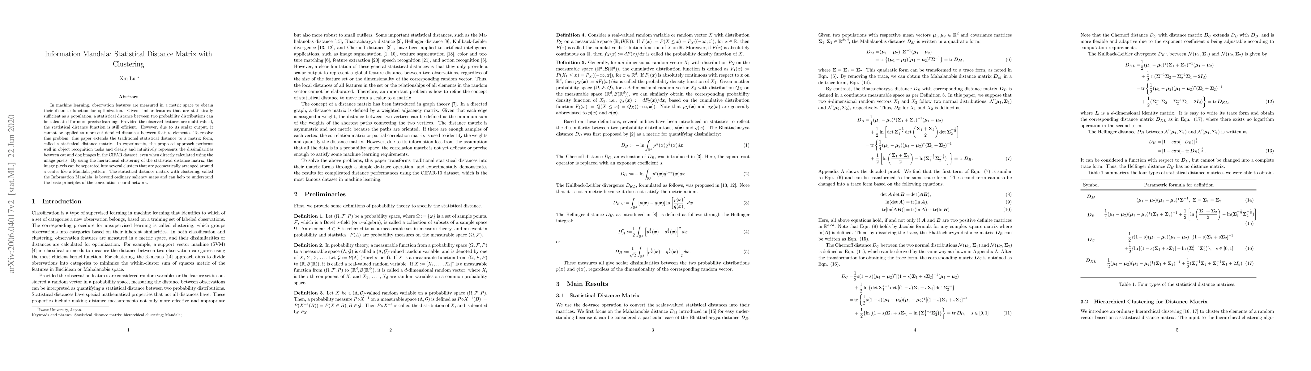 In machine learning, observation features are measured in a metric space to obtain their distance function for optimization. Given similar features that are statistically sufficient as a population, a statistical distance between two probability distributions can be calculated for more precise learning. Provided the observed features are multi-valued, the statistical distance function is still efficient. However, due to its scalar output, it cannot be applied to represent detailed distances between feature elements. To resolve this problem, this paper extends the traditional statistical distance to a matrix form, called a statistical distance matrix. In experiments, the proposed approach performs well in object recognition tasks and clearly and intuitively represents the dissimilarities between cat and dog images in the CIFAR dataset, even when directly calculated using the image pixels. By using the hierarchical clustering of the statistical distance matrix, the image pixels can be separated into several clusters that are geometrically arranged around a center like a Mandala pattern. The statistical distance matrix with clustering, called the Information Mandala, is beyond ordinary saliency maps and can help to understand the basic principles of the convolution neural network.
