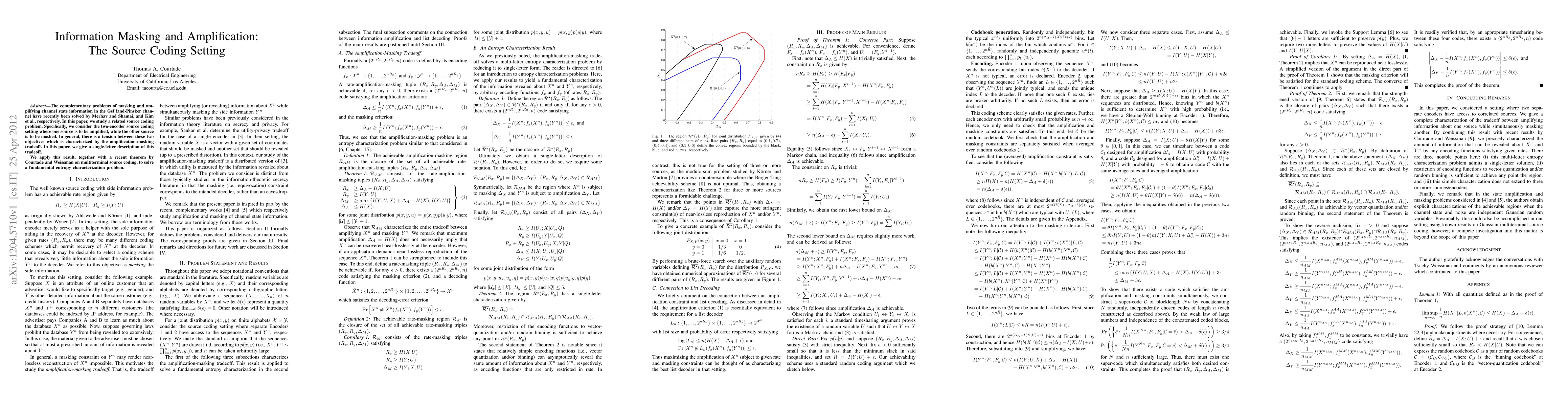 This paper investigates the source coding problem in a two-encoder setting where one source is to be amplified while the other is masked, characterizing the inherent tradeoff between these objectives. The authors provide a single-letter description of this amplification-masking tradeoff and apply it to solve a fundamental entropy characterization problem using a theorem from multiterminal source coding.