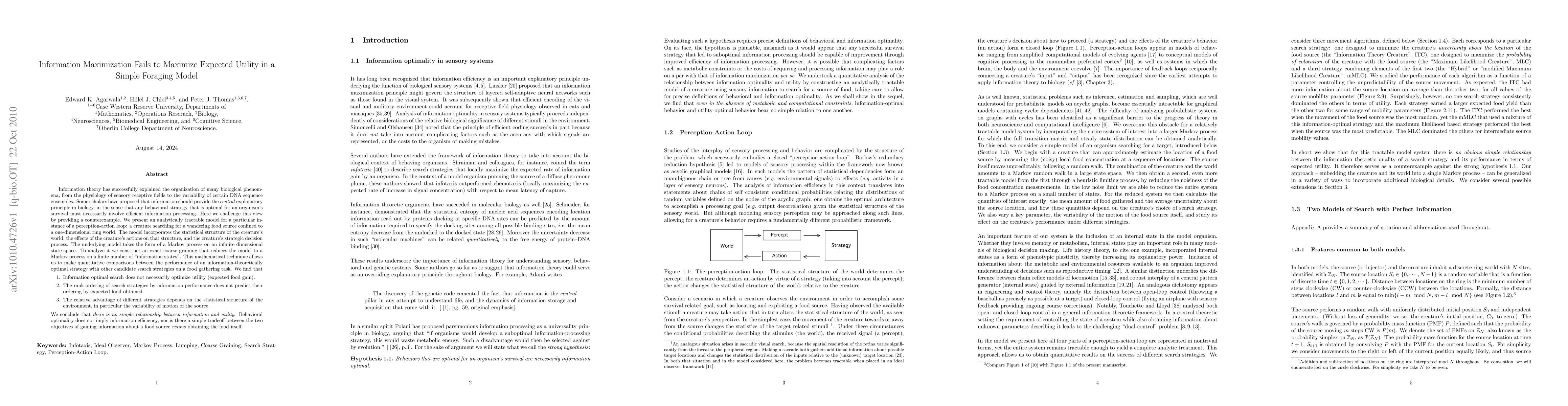 Information theory has explained the organization of many biological phenomena, from the physiology of sensory receptive fields to the variability of certain DNA sequence ensembles. Some scholars have proposed that information should provide the central explanatory principle in biology, in the sense that any behavioral strategy that is optimal for an organism's survival must necessarily involve efficient information processing. We challenge this view by providing a counterexample. We present an analytically tractable model for a particular instance of a perception-action loop: a creature searching for a food source confined to a one-dimensional ring world. The model incorporates the statistical structure of the creature's world, the effects of the creature's actions on that structure, and the creature's strategic decision process. The model takes the form of a Markov process on an infinite dimensional state space. To analyze it we construct an exact coarse graining that reduces the model to a Markov process on a finite number of "information states". This technique allows us to make quantitative comparisons between the performance of an information-theoretically optimal strategy with other candidate strategies on a food gathering task. We find that: 1. Information optimal search does not necessarily optimize utility (expected food gain). 2. The rank ordering of search strategies by information performance does not predict their ordering by expected food obtained. 3. The relative advantage of different strategies depends on the statistical structure of the environment, in particular the variability of motion of the source. We conclude that there is no simple relationship between information and utility. Behavioral optimality does not imply information efficiency, nor is there a simple tradeoff between gaining information about a food source versus obtaining the food itself.