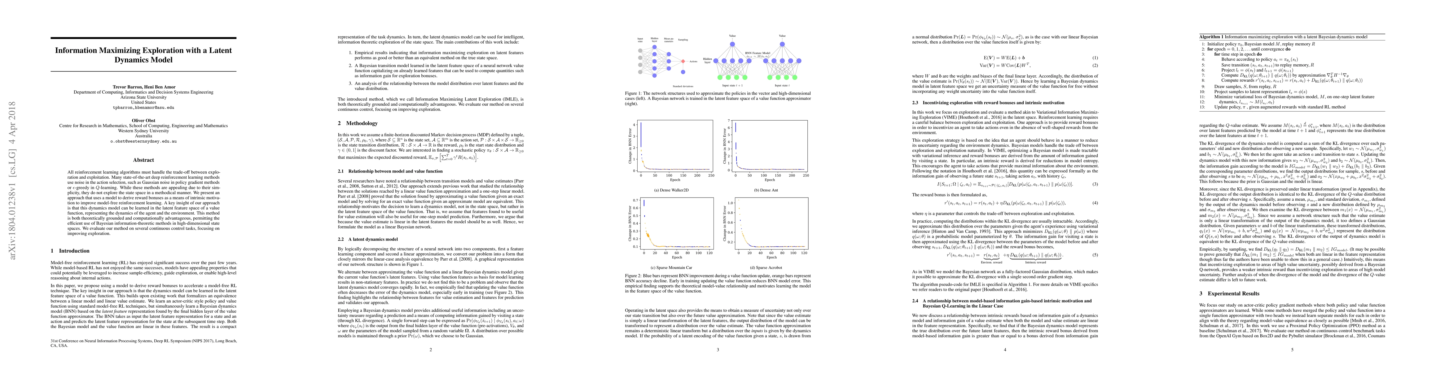 This paper proposes a reinforcement learning method that uses a latent dynamics model to derive reward bonuses for intrinsic motivation, enhancing exploration in a methodical way. The approach leverages Bayesian information-theoretic methods in the latent feature space of a value function, demonstrating computational efficiency and effectiveness in continuous control tasks.