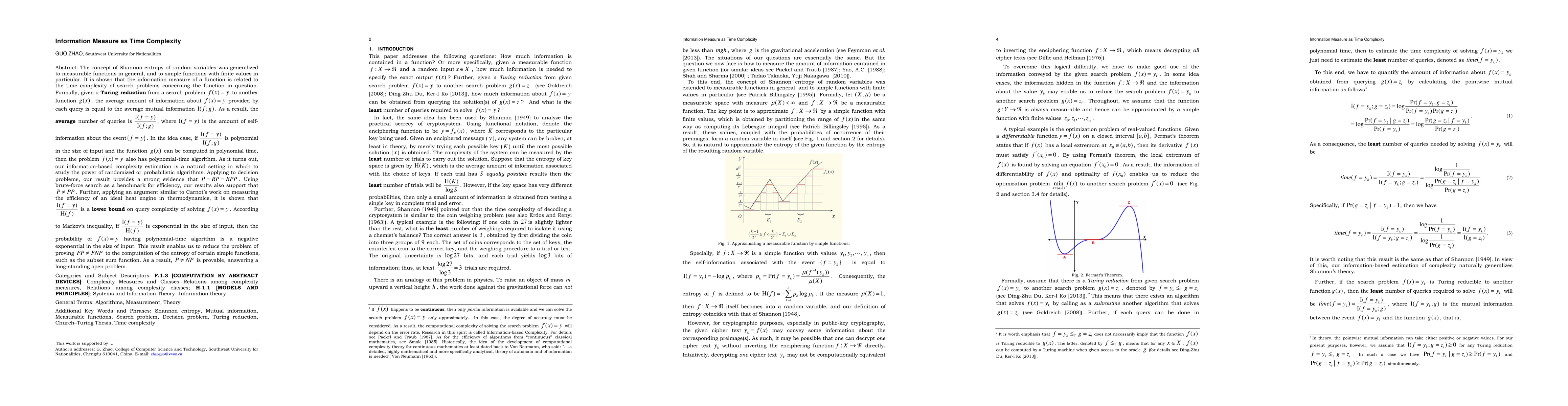 The concept of Shannon entropy of random variables was generalized to measurable functions in general, and to simple functions with finite values in particular. It is shown that the information measure of a function is related to the time complexity of search problems concerning the functions in question. Formally, given a Turing reduction from a search problem f(x)=y to another function g(x), the amount of information about f(x)=y provided by querying g(x) is exactly equal to the average mutual information I(f;g). As a result, the average number of queries is I(f=y)/I(f;g), where I(f) is amount of self-information about the event {f=y}. In the idea case, if I(f=y)/I(f;g) is polynomial in the size of input and the function g(x) can be computed in polynomial time, then the problem f(x)=y also has polynomial-time algorithm. As it turns out, our information-based complexity estimation is a natural setting in which to study the power of randomized or probabilistic algorithms. Applying to decision problems, our result provides a strong evidence that P=RP=BPP. Using brute-force search as a benchmark for efficiency, our results also support that P!=PP. Further, applying an argument similar to Carnot's work on measuring the efficiency of an ideal heat engine in thermodynamics, it is shown that I(f=y)/H(f) is a lower bound on query complexity of solving f(x)=y. According to Markov's inequality, if I(f=y)/H(f) is exponential in the size of input, then the probability of f(x)=y having polynomial-time algorithm is a negative exponential in the size of input. This result enables us to reduce the problem of proving FP!=FNP to the computation of the entropy of certain simple functions, such as the subset sum function. As a result, P!=NP is provable, answering a long-standing open problem.
