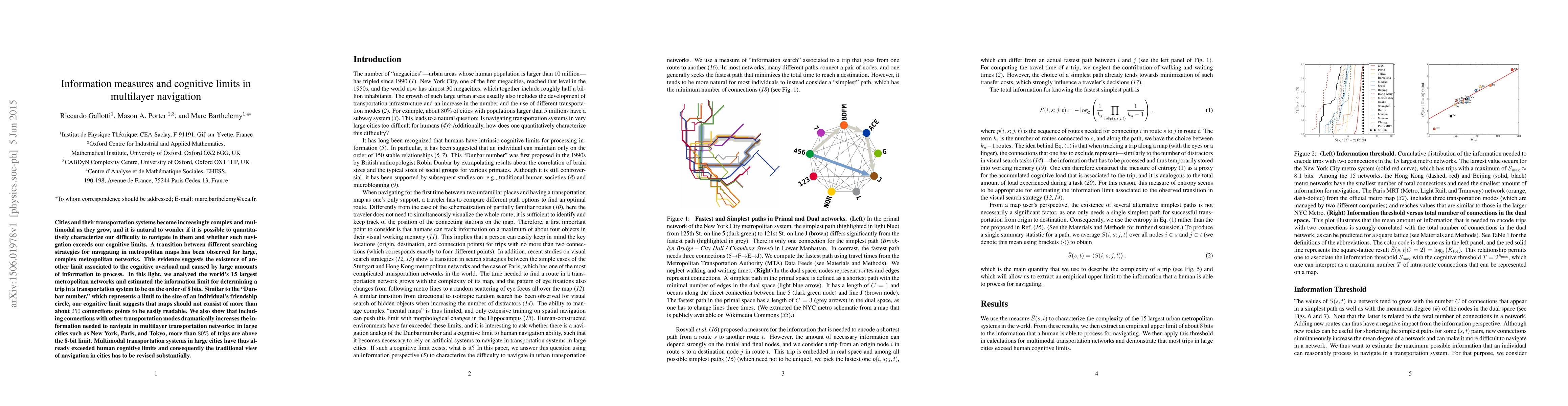 Cities and their transportation systems become increasingly complex and multimodal as they grow, and it is natural to wonder if it is possible to quantitatively characterize our difficulty to navigate in them and whether such navigation exceeds our cognitive limits. A transition between different searching strategies for navigating in metropolitan maps has been observed for large, complex metropolitan networks. This evidence suggests the existence of another limit associated to the cognitive overload and caused by large amounts of information to process. In this light, we analyzed the world's 15 largest metropolitan networks and estimated the information limit for determining a trip in a transportation system to be on the order of 8 bits. Similar to the "Dunbar number," which represents a limit to the size of an individual's friendship circle, our cognitive limit suggests that maps should not consist of more than about $250$ connections points to be easily readable. We also show that including connections with other transportation modes dramatically increases the information needed to navigate in multilayer transportation networks: in large cities such as New York, Paris, and Tokyo, more than $80\%$ of trips are above the 8-bit limit. Multimodal transportation systems in large cities have thus already exceeded human cognitive limits and consequently the traditional view of navigation in cities has to be revised substantially.
