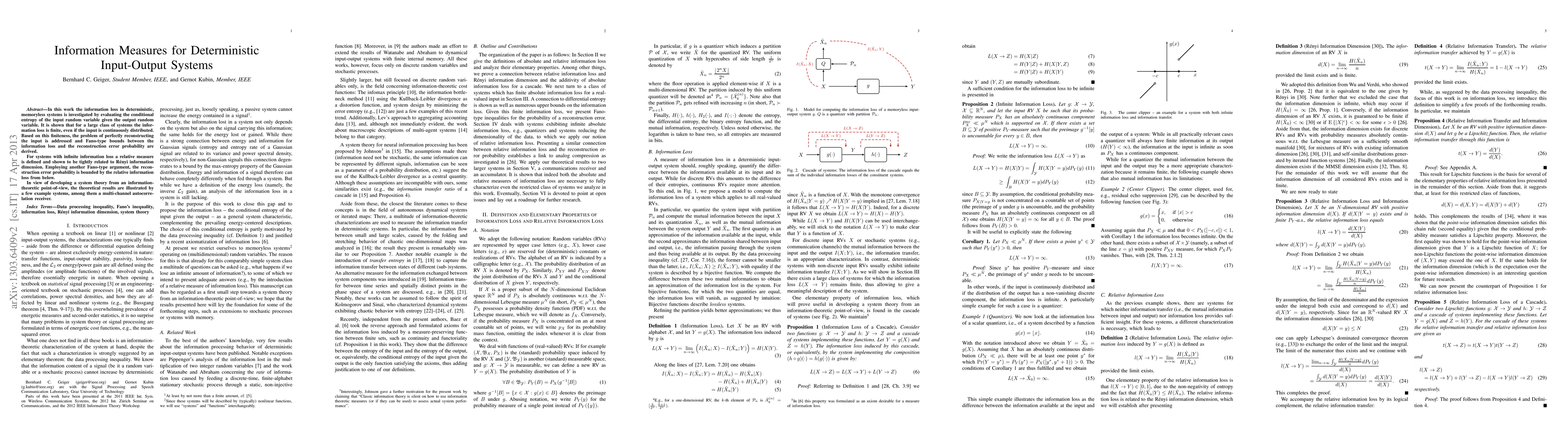 This paper investigates information loss in deterministic, memoryless systems by analyzing conditional entropy, demonstrating finite information loss for many systems and deriving Fano-type bounds for input reconstruction. It also introduces a relative measure for systems with infinite information loss, linking it to Rényi information dimension, and illustrates the results with examples including a multi-channel autocorrelation receiver.