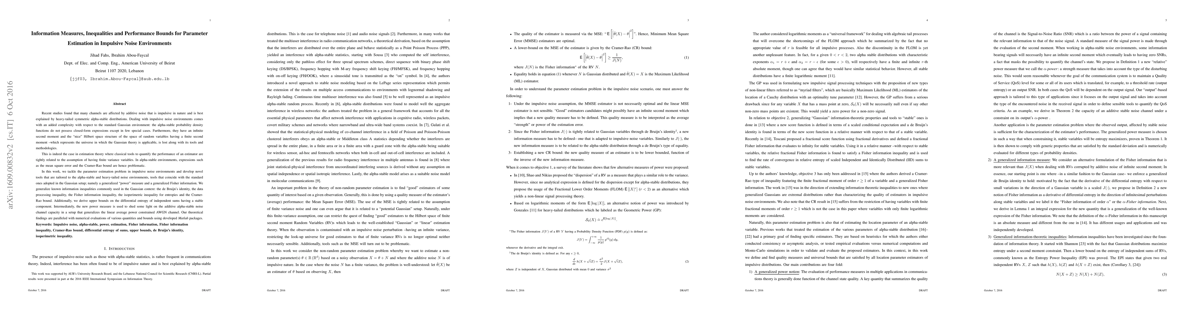 Recent studies found that many channels are affected by additive noise that is impulsive in nature and is best explained by heavy-tailed symmetric alpha-stable distributions. Dealing with impulsive noise environments comes with an added complexity with respect to the standard Gaussian environment: the alpha-stable probability density functions have an infinite second moment and the "nice" Hilbert space structure of the space of random variables having a finite second moment is lost along with its tools and methodologies. This is indeed the case in estimation theory where classical tools to quantify performance of an estimator are tightly related to the assumption of finite variance variables. In alpha-stable environments, expressions such as the mean square error and the Cramer-Rao bound are hence problematic. In this work, we tackle the parameter estimation problem in impulsive noise environments and develop novel tools that are tailored to the alpha-stable and heavy-tailed noise environments, tools that coincide with the standard ones adopted in the Gaussian setup, namely a generalized "power" measure and a generalized Fisher information. We generalize known information inequalities commonly used in the Gaussian context: the de Bruijn's identity, the data processing inequality, the Fisher information inequality, the isoperimetric inequality for entropies and the Cramer-Rao bound. Additionally, we derive upper bounds on the differential entropy of independent sums having a stable component. Finally, the new "power" measure is used to shed some light on the additive alpha-stable noise channel capacity in a setup that generalizes the linear average power constrained AWGN channel. Our theoretical findings are paralleled with numerical evaluations of various quantities and bounds using developed {\em Matlab} packages.