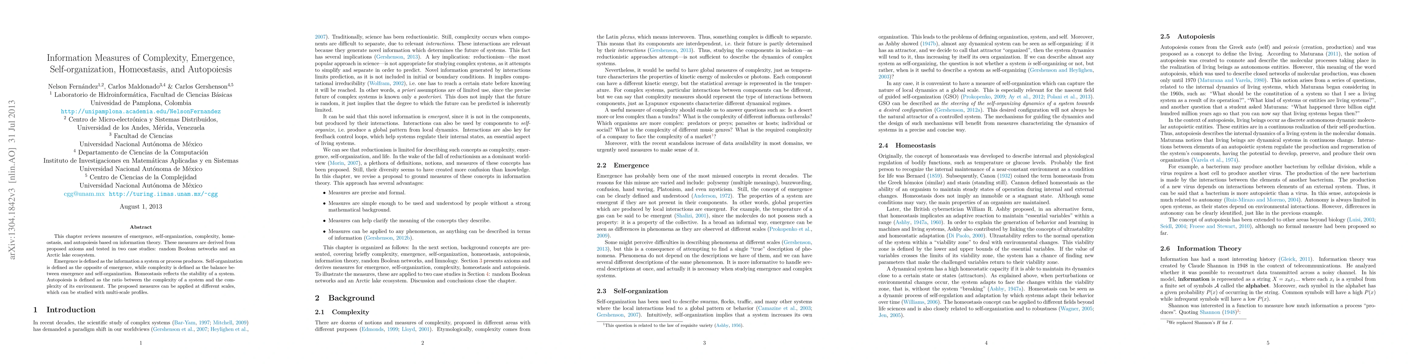This research reviews measures of emergence, self-organization, complexity, homeostasis, and autopoiesis based on information theory, deriving equations from postulated axioms and testing them in case studies of random Boolean networks and an Arctic lake ecosystem.