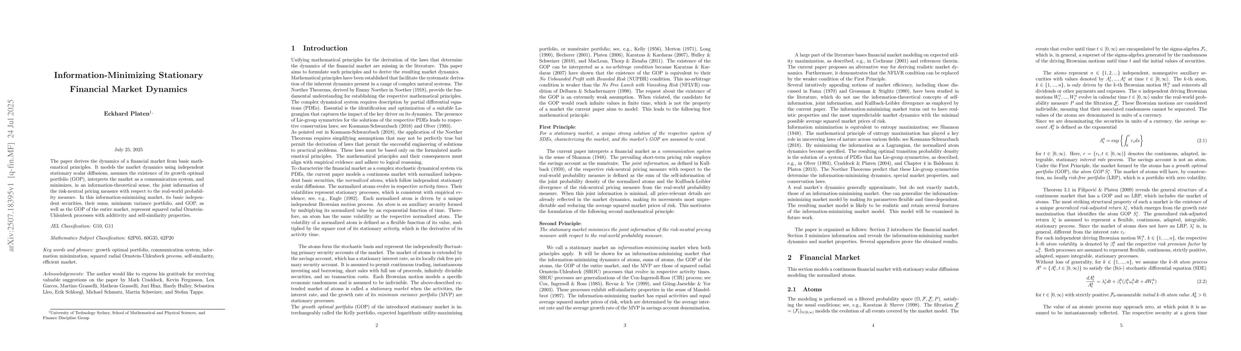 The paper derives the dynamics of a financial market from basic mathematical principles. It models the market dynamics using independent stationary scalar diffusions, assumes the existence of its growth optimal portfolio (GOP), interprets the market as a communication system, and minimizes, in an information-theoretical sense, the joint information of the risk-neutral pricing measure with respect to the real-world probability measure. In this information-minimizing market, its basic independent securities, their sums, minimum variance portfolio, and GOP, as well as the GOP of the entire market, represent squared radial Ornstein-Uhlenbeck processes with additivity and self-similarity properties.
