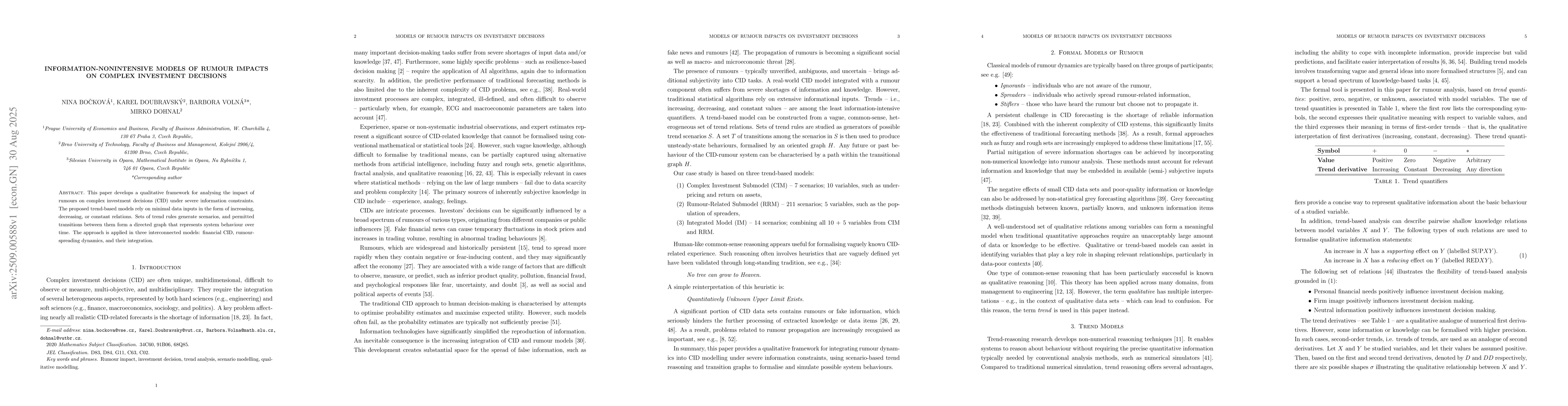 This paper develops a qualitative framework for analysing the impact of rumours on complex investment decisions (CID) under severe information constraints. The proposed trend-based models rely on minimal data inputs in the form of increasing, decreasing, or constant relations. Sets of trend rules generate scenarios, and permitted transitions between them form a directed graph that represents system behaviour over time. The approach is applied in three interconnected models: financial CID, rumour-spreading dynamics, and their integration.