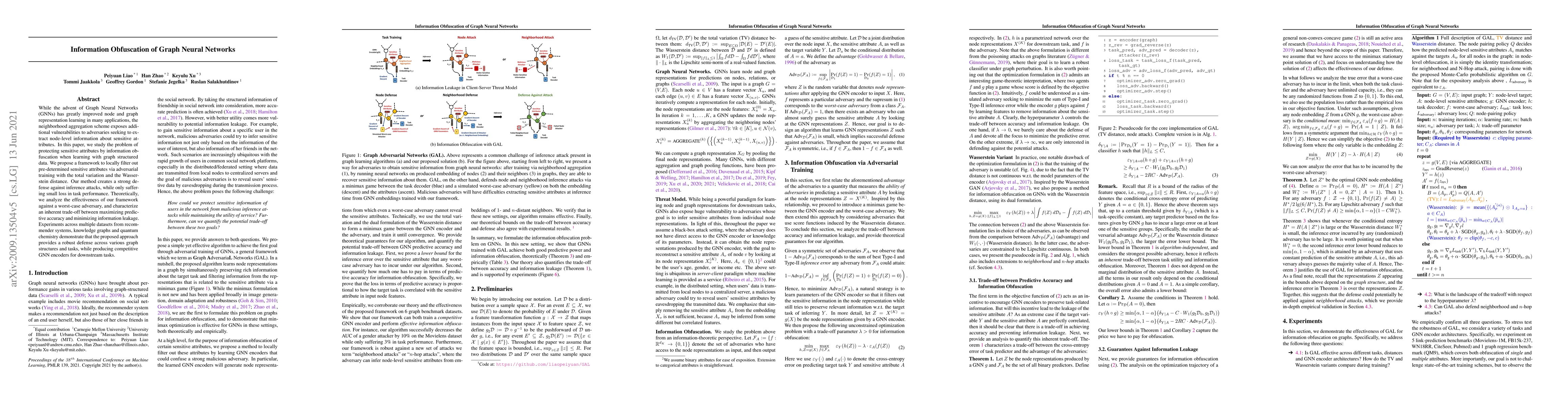 While the advent of Graph Neural Networks (GNNs) has greatly improved node and graph representation learning in many applications, the neighborhood aggregation scheme exposes additional vulnerabilities to adversaries seeking to extract node-level information about sensitive attributes. In this paper, we study the problem of protecting sensitive attributes by information obfuscation when learning with graph structured data. We propose a framework to locally filter out pre-determined sensitive attributes via adversarial training with the total variation and the Wasserstein distance. Our method creates a strong defense against inference attacks, while only suffering small loss in task performance. Theoretically, we analyze the effectiveness of our framework against a worst-case adversary, and characterize an inherent trade-off between maximizing predictive accuracy and minimizing information leakage. Experiments across multiple datasets from recommender systems, knowledge graphs and quantum chemistry demonstrate that the proposed approach provides a robust defense across various graph structures and tasks, while producing competitive GNN encoders for downstream tasks.