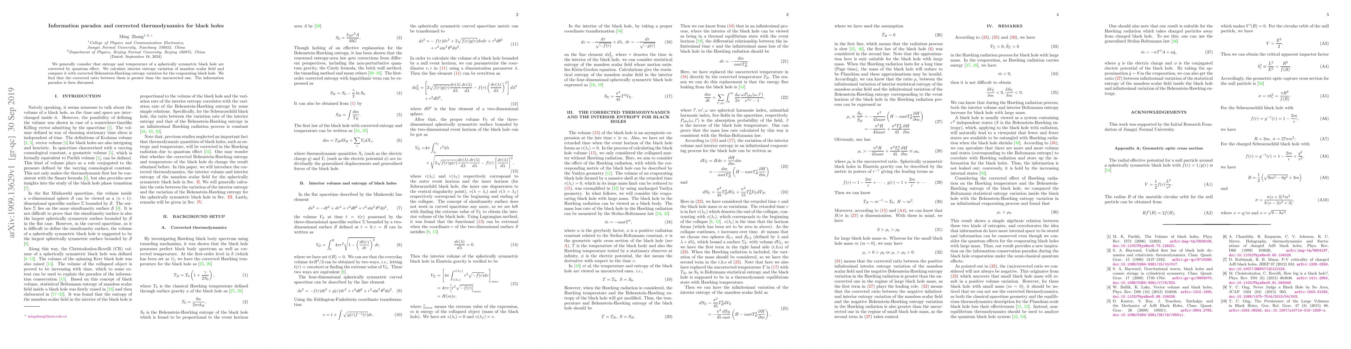 We generally consider that entropy and temperature of a spherically symmetric black hole are corrected by quantum effect. We calculate interior entropy variation of massless scalar field and compare it with corrected Bekenstein-Hawking entropy variation for the evaporating black hole. We find that the corrected ratio between them is greater than the uncorrected one. The information paradox is then discussed.