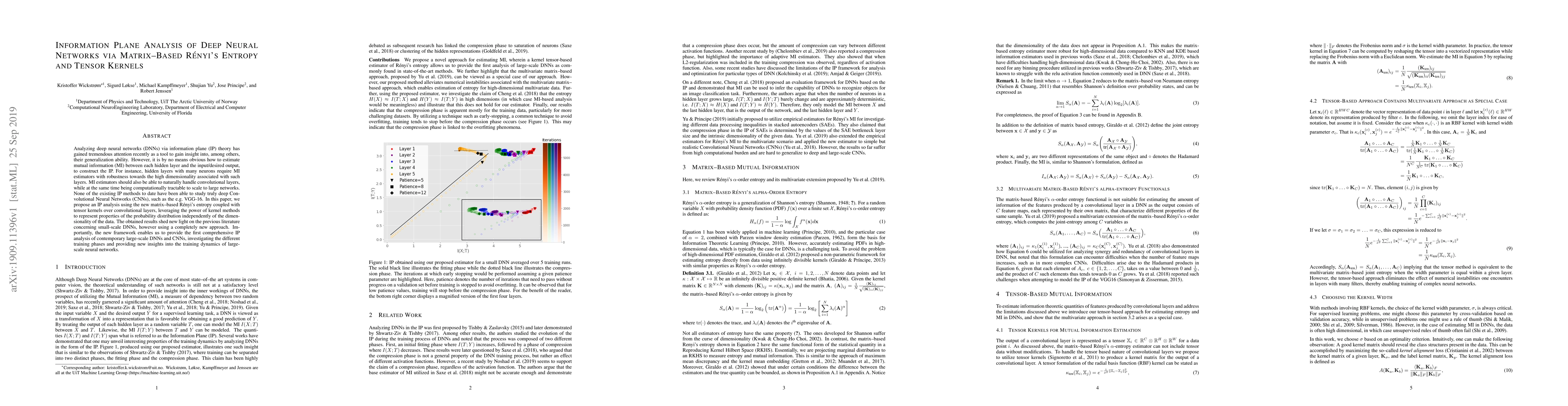 Analyzing deep neural networks (DNNs) via information plane (IP) theory has gained tremendous attention recently as a tool to gain insight into, among others, their generalization ability. However, it is by no means obvious how to estimate mutual information (MI) between each hidden layer and the input/desired output, to construct the IP. For instance, hidden layers with many neurons require MI estimators with robustness towards the high dimensionality associated with such layers. MI estimators should also be able to naturally handle convolutional layers, while at the same time being computationally tractable to scale to large networks. None of the existing IP methods to date have been able to study truly deep Convolutional Neural Networks (CNNs), such as the e.g.\ VGG-16. In this paper, we propose an IP analysis using the new matrix--based R\'enyi's entropy coupled with tensor kernels over convolutional layers, leveraging the power of kernel methods to represent properties of the probability distribution independently of the dimensionality of the data. The obtained results shed new light on the previous literature concerning small-scale DNNs, however using a completely new approach. Importantly, the new framework enables us to provide the first comprehensive IP analysis of contemporary large-scale DNNs and CNNs, investigating the different training phases and providing new insights into the training dynamics of large-scale neural networks.