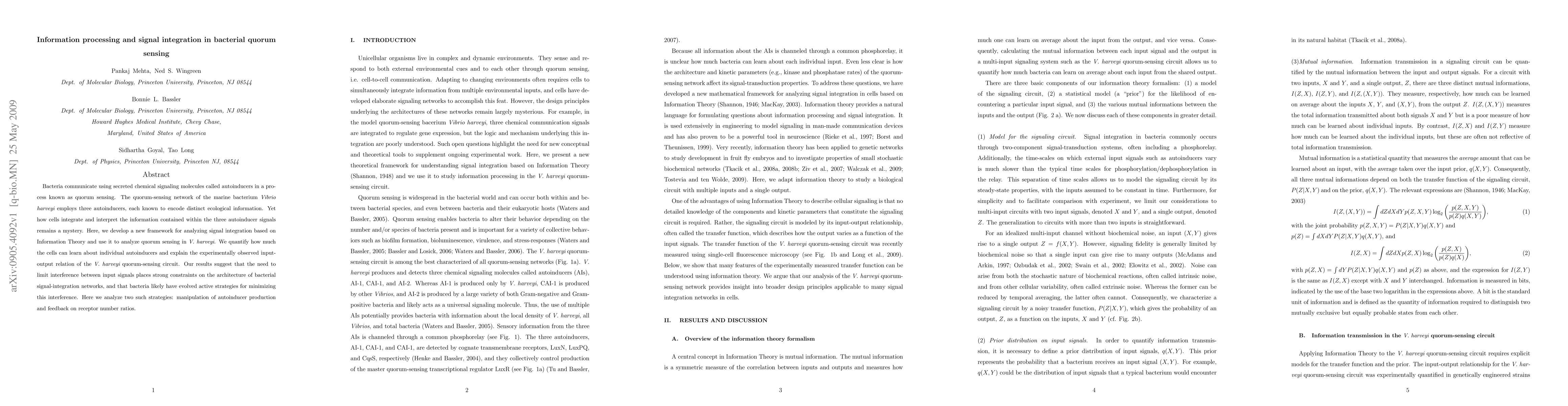 This paper develops a framework using Information Theory to analyze signal integration in {\it Vibrio harveyi}'s quorum-sensing network, revealing how bacteria minimize interference between distinct autoinducer signals and suggesting evolved strategies like manipulating autoinducer production and receptor feedback.