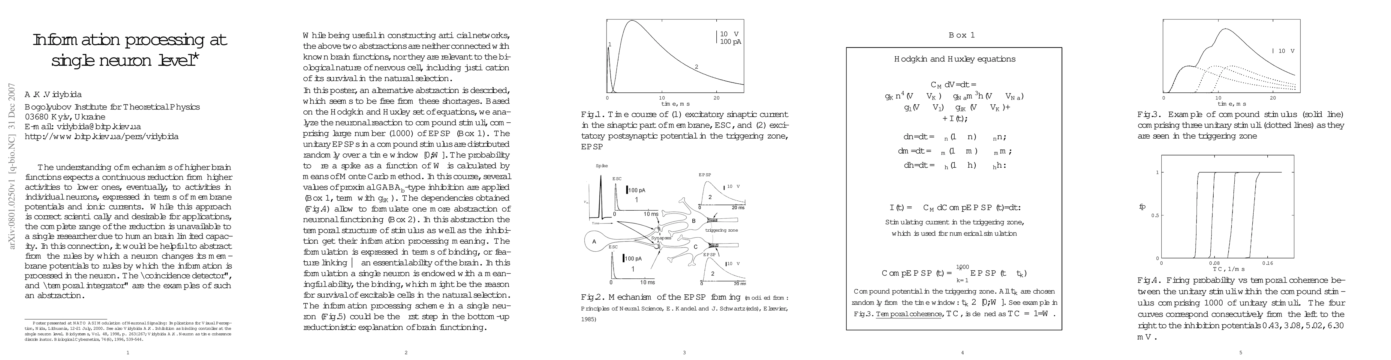 Based on numerical simulation of Hodgkin and Huxley type neuron stimulated from many synaptic inputs, an abstract concept of signal processing in individual neuron is proposed. In the concept proposed, neuron performs binding of synaptic inputs into a single output event, based on the degree of temporal coherence between the inputs. Inhibition serves as controlling factor of this type of binding.