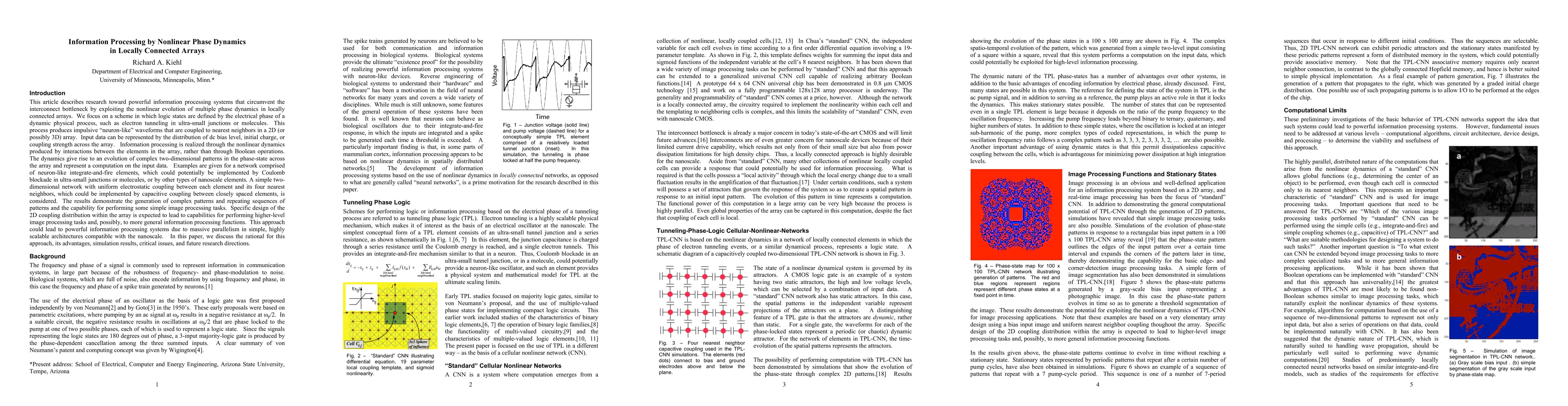 Research toward powerful information processing systems that circumvent the interconnect bottleneck by exploiting the nonlinear evolution of multiple phase dynamics in locally connected arrays is discussed. We focus on a scheme in which logic states are defined by the electrical phase of a dynamic process and information processing is realized through interactions between the elements in the array. Simulation results are given for networks comprised of neuron-like integrate-and-fire elements, which could potentially be implemented by ultra-small tunnel junctions, molecules and other types of nanoscale elements. This approach could lead to powerful information processing systems due to massive parallelism in simple, highly scalable nano-architectures. The rational for this approach, its advantages, simulation results, critical issues, and future research directions are discussed.