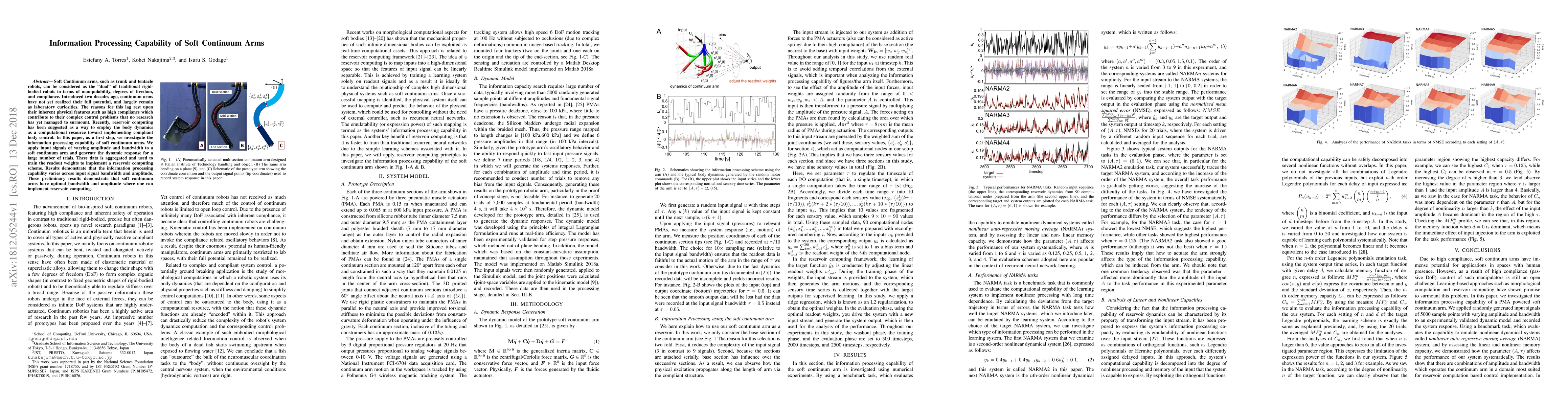 Soft Continuum arms, such as trunk and tentacle robots, can be considered as the "dual" of traditional rigid-bodied robots in terms of manipulability, degrees of freedom, and compliance. Introduced two decades ago, continuum arms have not yet realized their full potential, and largely remain as laboratory curiosities. The reasons for this lag rest upon their inherent physical features such as high compliance which contribute to their complex control problems that no research has yet managed to surmount. Recently, reservoir computing has been suggested as a way to employ the body dynamics as a computational resource toward implementing compliant body control. In this paper, as a first step, we investigate the information processing capability of soft continuum arms. We apply input signals of varying amplitude and bandwidth to a soft continuum arm and generate the dynamic response for a large number of trials. These data is aggregated and used to train the readout weights to implement a reservoir computing scheme. Results demonstrate that the information processing capability varies across input signal bandwidth and amplitude. These preliminary results demonstrate that soft continuum arms have optimal bandwidth and amplitude where one can implement reservoir computing.