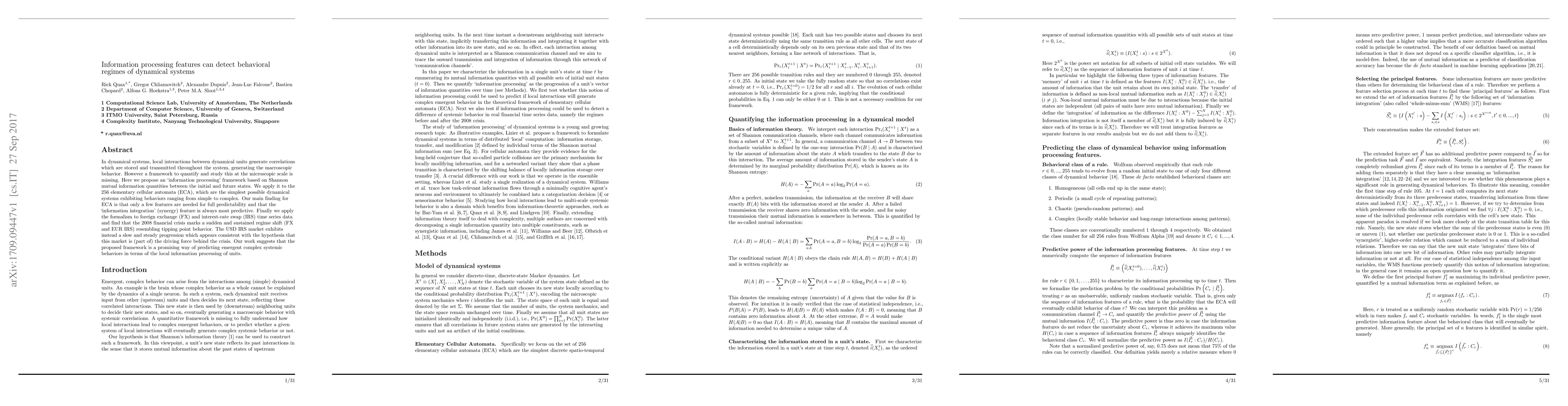 In dynamical systems, local interactions between dynamical units generate correlations which are stored and transmitted throughout the system, generating the macroscopic behavior. However a framework to quantify and study this at the microscopic scale is missing. Here we propose an 'information processing' framework based on Shannon mutual information quantities between the initial and future states. We apply it to the 256 elementary cellular automata (ECA), which are the simplest possible dynamical systems exhibiting behaviors ranging from simple to complex. Our main finding for ECA is that only a few features are needed for full predictability and that the 'information integration' (synergy) feature is always most predictive. Finally we apply the formalism to foreign exchange (FX) and interest-rate swap (IRS) time series data and find that the 2008 financial crisis marks a sudden and sustained regime shift (FX and EUR IRS) resembling tipping point behavior. The USD IRS market exhibits instead a slow and steady progression which appears consistent with the hypothesis that this market is (part of) the driving force behind the crisis. Our work suggests that the proposed framework is a promising way of predicting emergent complex systemic behaviors in terms of the local information processing of units.
