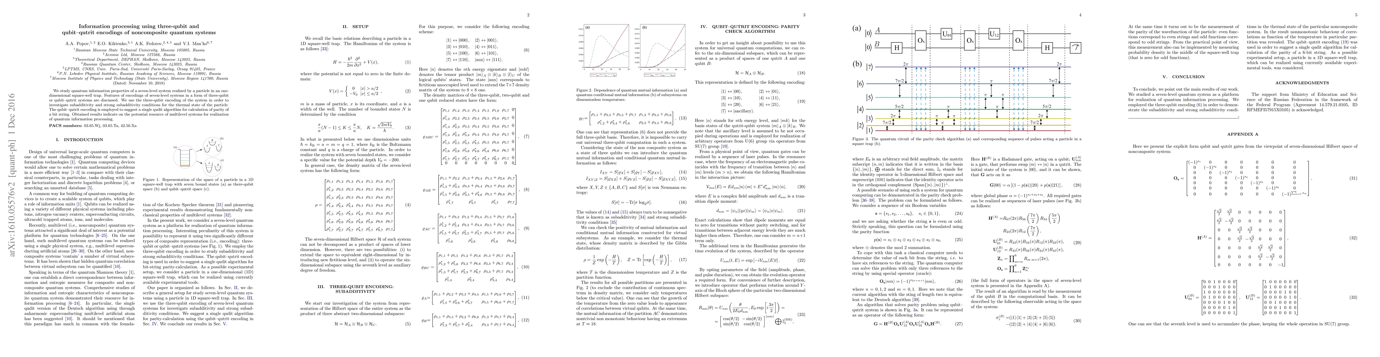 This paper explores quantum information processing using three-qubit and qubit-qutrit encodings for a seven-level system in a one-dimensional square-well trap. It investigates the subadditivity and strong subadditivity conditions for the thermal state and proposes a single qudit algorithm for bit string parity calculation, highlighting the potential of multilevel systems in quantum information processing.