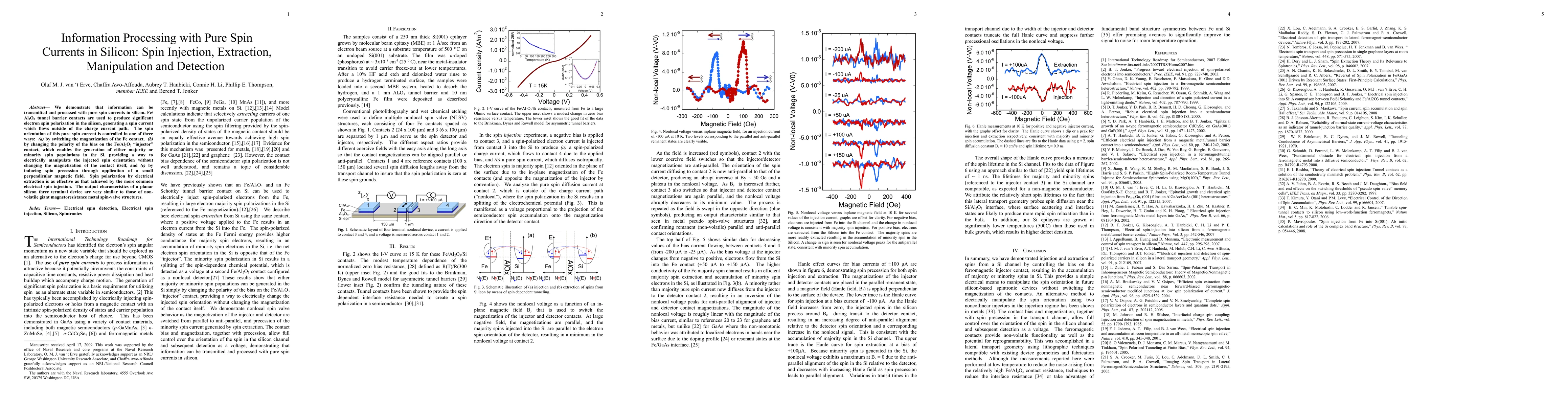 This paper demonstrates the transmission and processing of information using pure spin currents in silicon, utilizing Fe/Al2O3 tunnel barriers to generate significant spin polarization. The spin current's orientation is manipulated electrically via magnetization switching, bias polarity changes, or magnetic field application, showing comparable extraction efficiency to conventional methods.