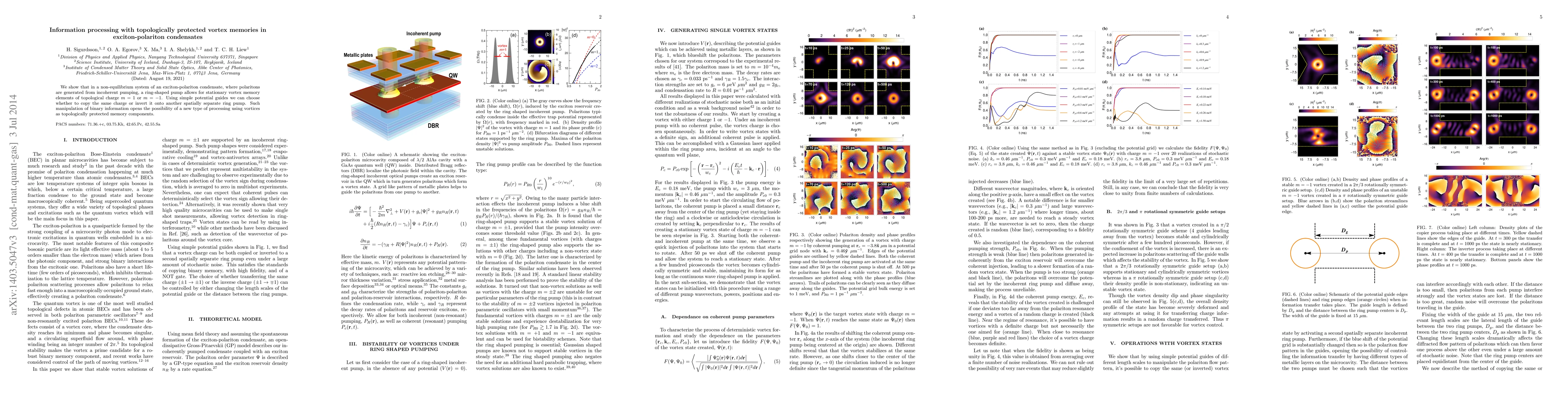This paper demonstrates the creation of topologically protected vortex memory elements in exciton-polariton condensates using a ring-shaped pump, enabling binary information processing. The study shows how these vortices can be copied or inverted, suggesting a novel approach for topologically protected information processing.