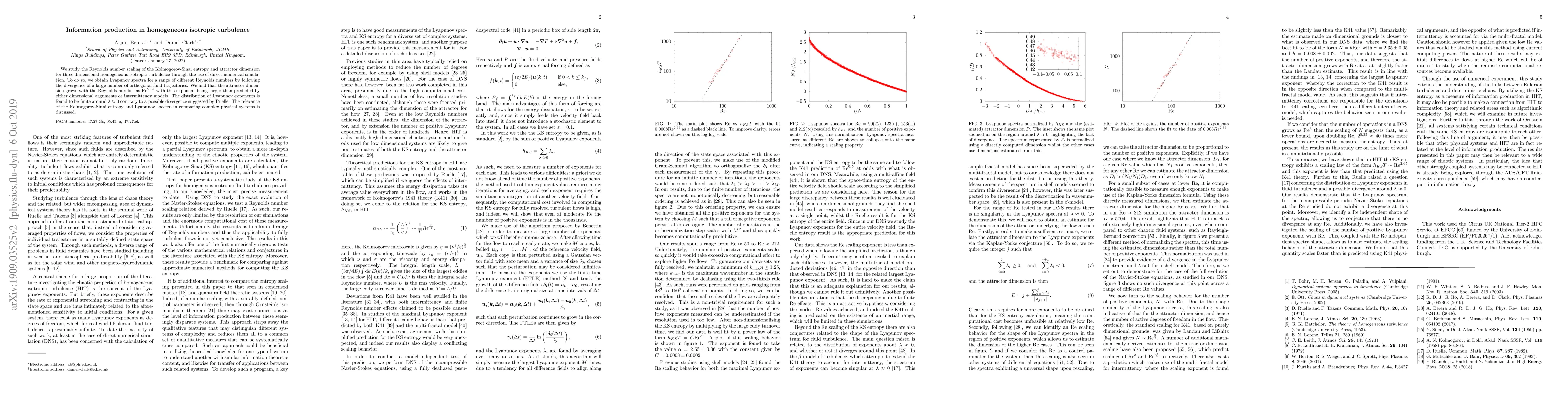 We study the Reynolds number scaling of the Kolmogorov-Sinai entropy and attractor dimension for three dimensional homogeneous isotropic turbulence through the use of direct numerical simulation. To do so, we obtain Lyapunov spectra for a range of different Reynolds numbers by following the divergence of a large number of orthogonal fluid trajectories. We find that the attractor dimension grows with the Reynolds number as Re$^{2.35}$ with this exponent being larger than predicted by either dimensional arguments or intermittency models. The distribution of Lyapunov exponents is found to be finite around $\lambda \approx 0$ contrary to a possible divergence suggested by Ruelle. The relevance of the Kolmogorov-Sinai entropy and Lyapunov spectra in comparing complex physical systems is discussed.