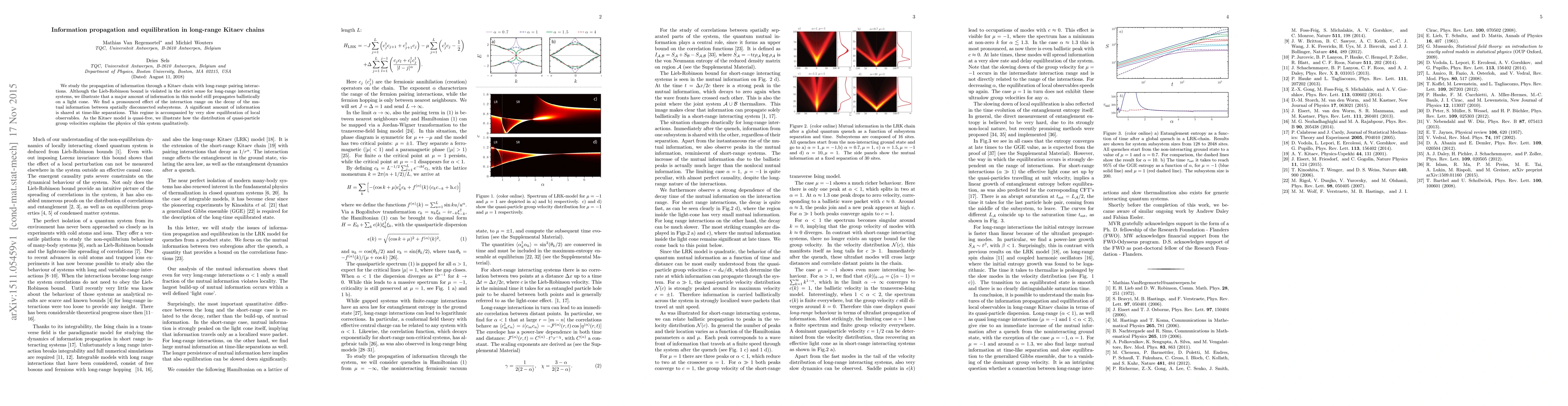Demonstrating ballistic information propagation and slow equilibration in long-range Kitaev chains, with a focus on the role of quasi-particle group velocities.