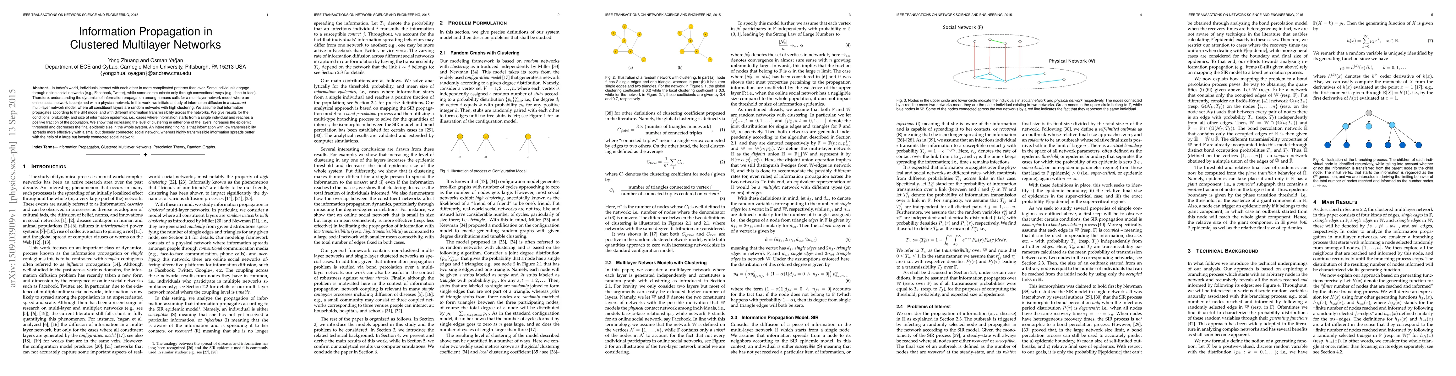 The paper presents a novel approach to model and analyze information propagation in clustered multi-layer networks using bond percolation and SIR models, providing insights into epidemic thresholds and sizes.