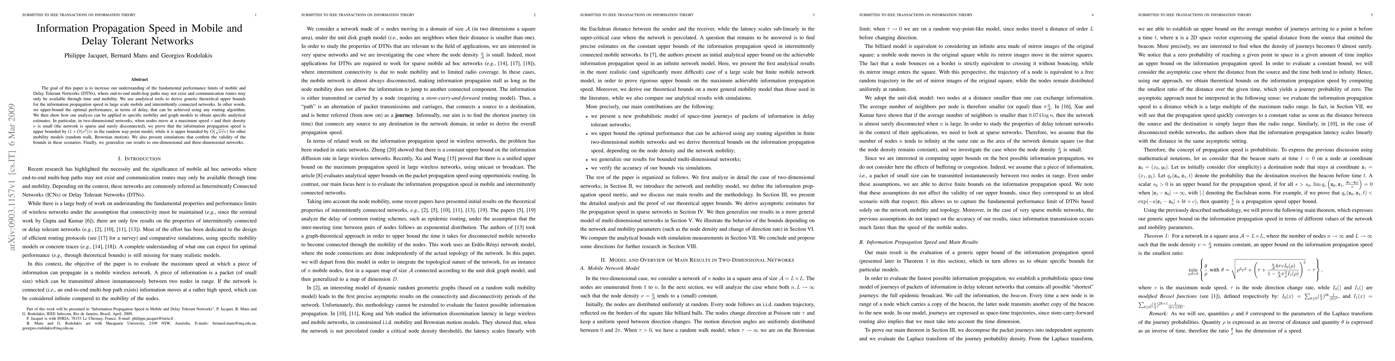 This paper investigates the theoretical upper bounds for information propagation speed in mobile and Delay Tolerant Networks, deriving specific analytical estimates for various mobility models and confirming these bounds through simulations. The results show that in sparse, two-dimensional networks, the propagation speed is upper bounded by ($1+O(\nu^2))v$ in the random way-point model and $O(\sqrt{\nu v} v)$ for other models.