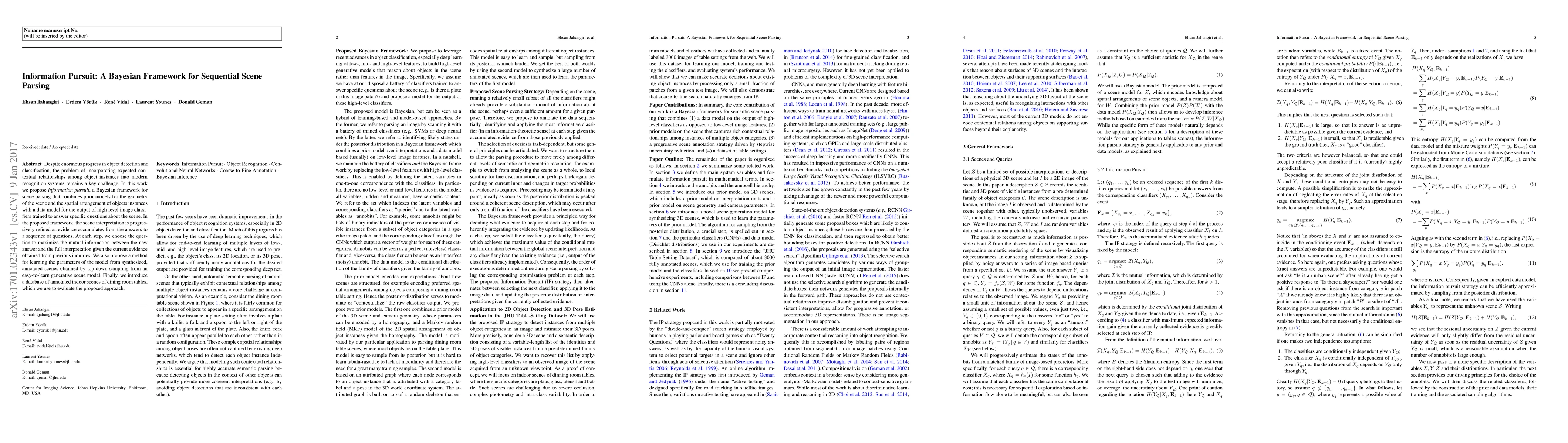 Despite enormous progress in object detection and classification, the problem of incorporating expected contextual relationships among object instances into modern recognition systems remains a key challenge. In this work we propose Information Pursuit, a Bayesian framework for scene parsing that combines prior models for the geometry of the scene and the spatial arrangement of objects instances with a data model for the output of high-level image classifiers trained to answer specific questions about the scene. In the proposed framework, the scene interpretation is progressively refined as evidence accumulates from the answers to a sequence of questions. At each step, we choose the question to maximize the mutual information between the new answer and the full interpretation given the current evidence obtained from previous inquiries. We also propose a method for learning the parameters of the model from synthesized, annotated scenes obtained by top-down sampling from an easy-to-learn generative scene model. Finally, we introduce a database of annotated indoor scenes of dining room tables, which we use to evaluate the proposed approach.