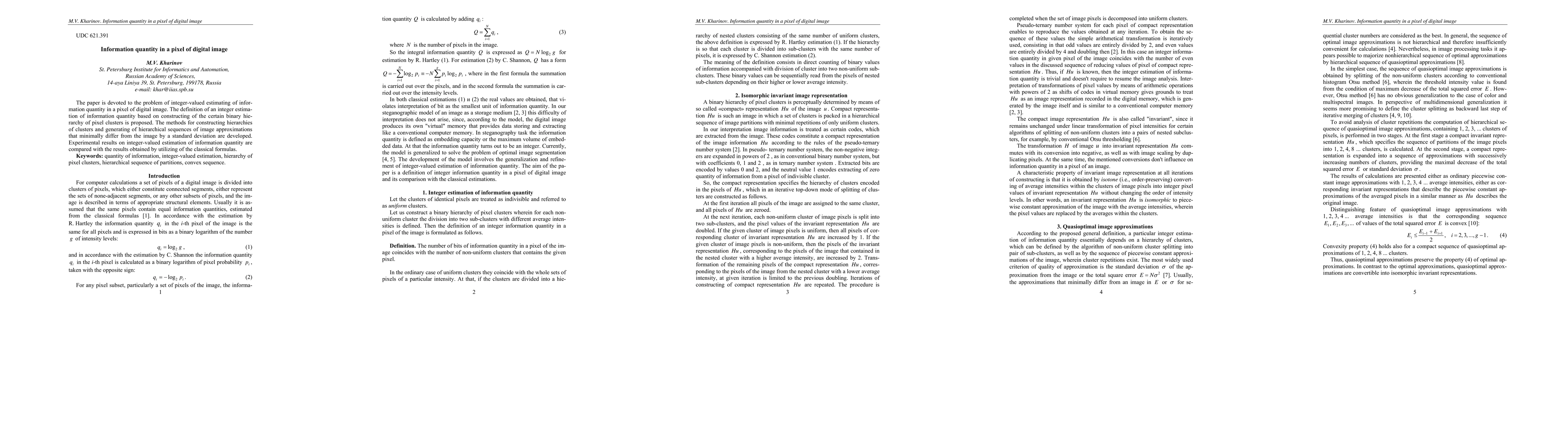 The paper is devoted to the problem of integer-valued estimating of information quantity in a pixel of digital image. The definition of an integer estimation of information quantity based on constructing of the certain binary hierarchy of pixel clusters is proposed. The methods for constructing hierarchies of clusters and generating of hierarchical sequences of image approximations that minimally differ from the image by a standard deviation are developed. Experimental results on integer-valued estimation of information quantity are compared with the results obtained by utilizing of the classical formulas.