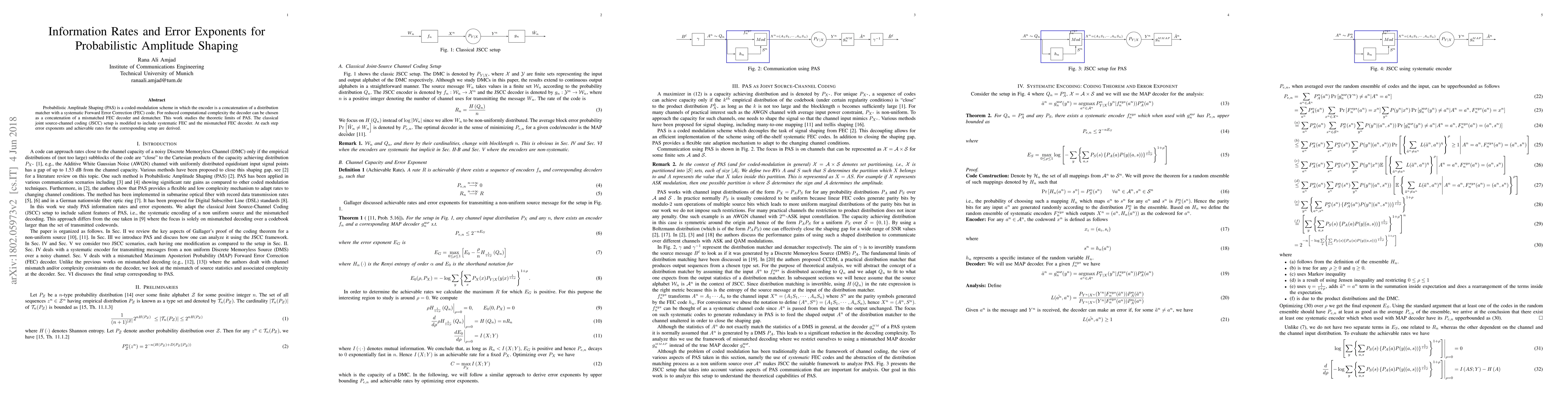Probabilistic Amplitude Shaping (PAS) is a coded-modulation scheme in which the encoder is a concatenation of a distribution matcher with a systematic Forward Error Correction (FEC) code. For reduced computational complexity the decoder can be chosen as a concatenation of a mismatched FEC decoder and dematcher. This work studies the theoretic limits of PAS. The classical joint source-channel coding (JSCC) setup is modified to include systematic FEC and the mismatched FEC decoder. At each step error exponents and achievable rates for the corresponding setup are derived.