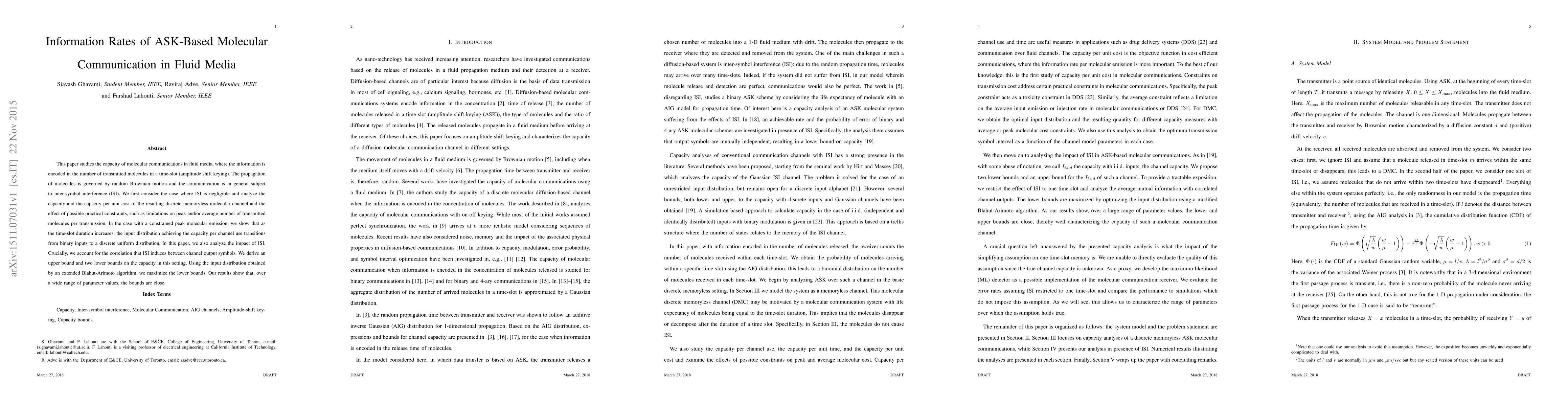 This paper studies the capacity of molecular communications in fluid media, where the information is encoded in the number of transmitted molecules in a time-slot (amplitude shift keying). The propagation of molecules is governed by random Brownian motion and the communication is in general subject to inter-symbol interference (ISI). We first consider the case where ISI is negligible and analyze the capacity and the capacity per unit cost of the resulting discrete memoryless molecular channel and the effect of possible practical constraints, such as limitations on peak and/or average number of transmitted molecules per transmission. In the case with a constrained peak molecular emission, we show that as the time-slot duration increases, the input distribution achieving the capacity per channel use transitions from binary inputs to a discrete uniform distribution. In this paper, we also analyze the impact of ISI. Crucially, we account for the correlation that ISI induces between channel output symbols. We derive an upper bound and two lower bounds on the capacity in this setting. Using the input distribution obtained by an extended Blahut-Arimoto algorithm, we maximize the lower bounds. Our results show that, over a wide range of parameter values, the bounds are close.