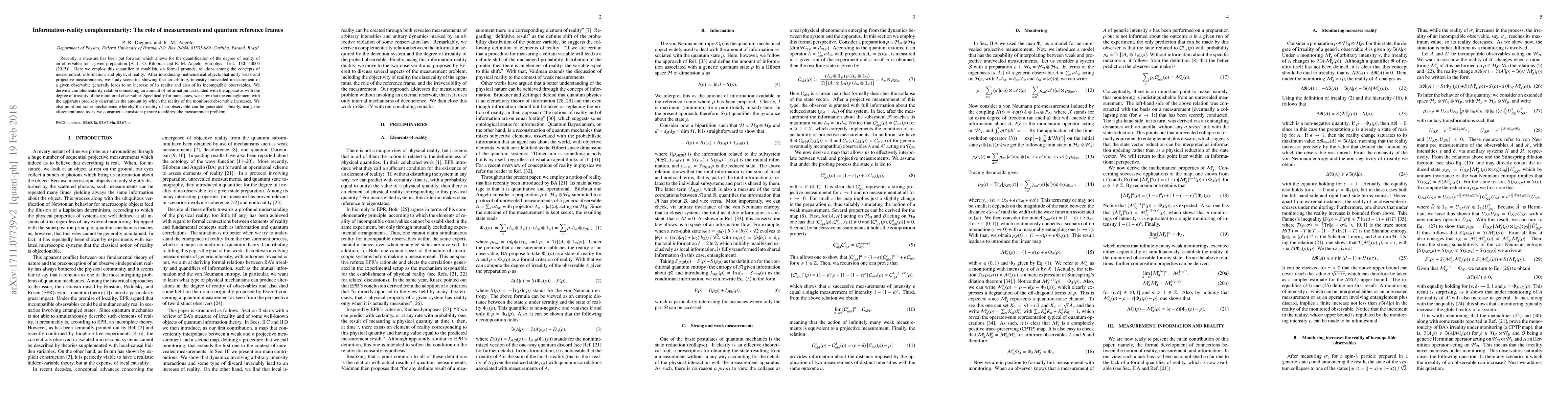 Recently, a measure has been put forward which allows for the quantification of the degree of reality of an observable for a given preparation [A. L. O. Bilobran and R. M. Angelo, Europhys. Lett. 112, 40005 (2015)]. Here we employ this quantifier to establish, on formal grounds, relations among the concepts of measurement, information, and physical reality. After introducing mathematical objects that unify weak and projective measurements, we study scenarios showing that an arbitrary-intensity unrevealed measurement of a given observable generally leads to an increase of its reality and also of its incompatible observables. We derive a complementarity relation connecting an amount of information associated with the apparatus with the degree of irreality of the monitored observable. Specifically for pure states, we show that the entanglement with the apparatus precisely determines the amount by which the reality of the monitored observable increases. We also point out some mechanisms whereby the irreality of an observable can be generated. Finally, using the aforementioned tools, we construct a consistent picture to address the measurement problem.