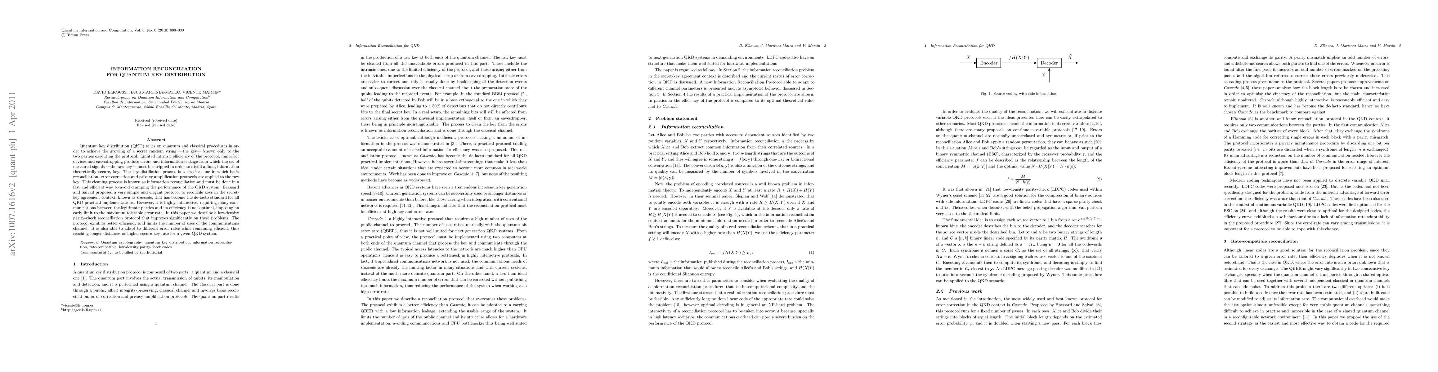 Quantum key distribution (QKD) relies on quantum and classical procedures in order to achieve the growing of a secret random string -the key- known only to the two parties executing the protocol. Limited intrinsic efficiency of the protocol, imperfect devices and eavesdropping produce errors and information leakage from which the set of measured signals -the raw key- must be stripped in order to distill a final, information theoretically secure, key. The key distillation process is a classical one in which basis reconciliation, error correction and privacy amplification protocols are applied to the raw key. This cleaning process is known as information reconciliation and must be done in a fast and efficient way to avoid cramping the performance of the QKD system. Brassard and Salvail proposed a very simple and elegant protocol to reconcile keys in the secret-key agreement context, known as Cascade, that has become the de-facto standard for all QKD practical implementations. However, it is highly interactive, requiring many communications between the legitimate parties and its efficiency is not optimal, imposing an early limit to the maximum tolerable error rate. In this paper we describe a low-density parity-check reconciliation protocol that improves significantly on these problems. The protocol exhibits better efficiency and limits the number of uses of the communications channel. It is also able to adapt to different error rates while remaining efficient, thus reaching longer distances or higher secure key rate for a given QKD system.