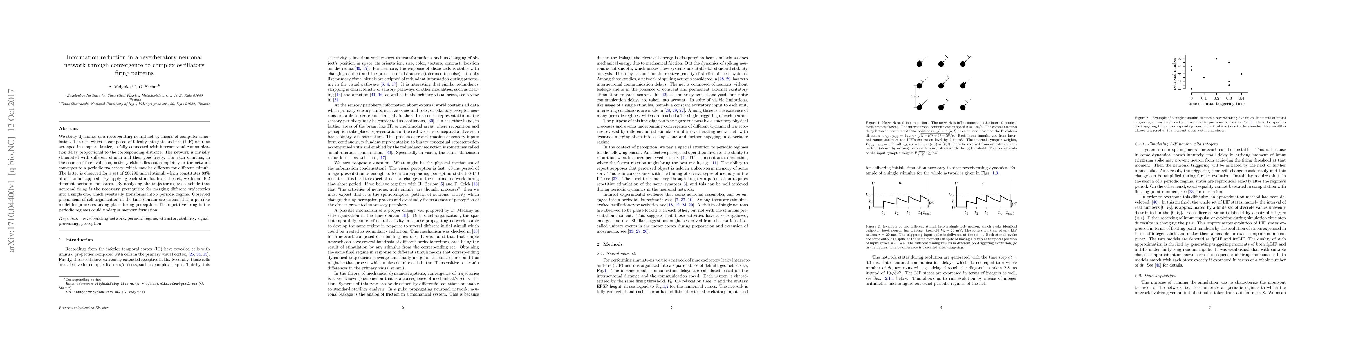 This paper investigates the dynamics of a reverberating neural network composed of 9 LIF neurons, finding that 83% of stimuli lead to convergence to complex oscillatory firing patterns. The network's self-organization into periodic regimes suggests a model for perception and memory formation.