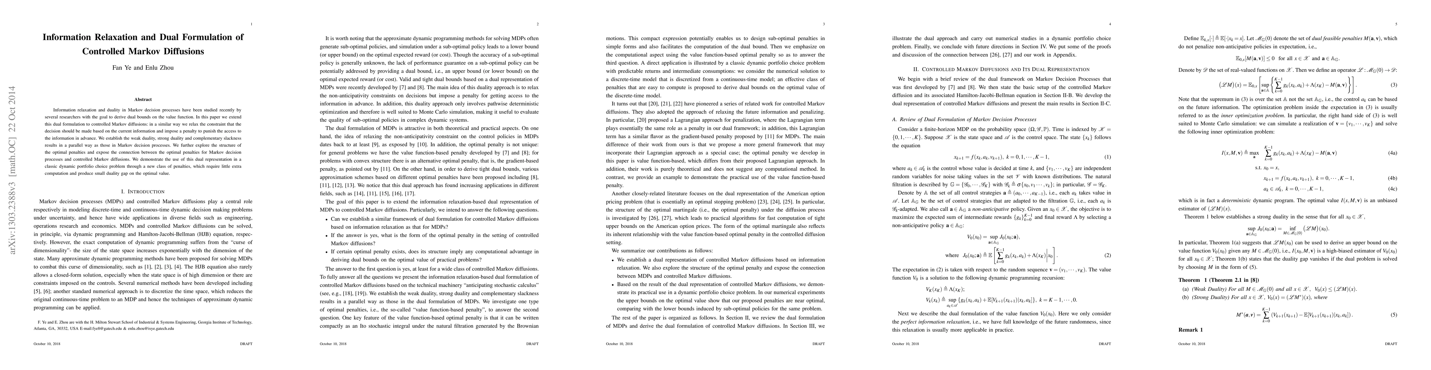 This paper extends dual formulation techniques from Markov decision processes to controlled Markov diffusions, establishing weak and strong duality, and demonstrating their application in dynamic portfolio choice problems. The study introduces new penalty classes to derive upper bounds, showing small gaps indicating near-optimality of sub-optimal policies.