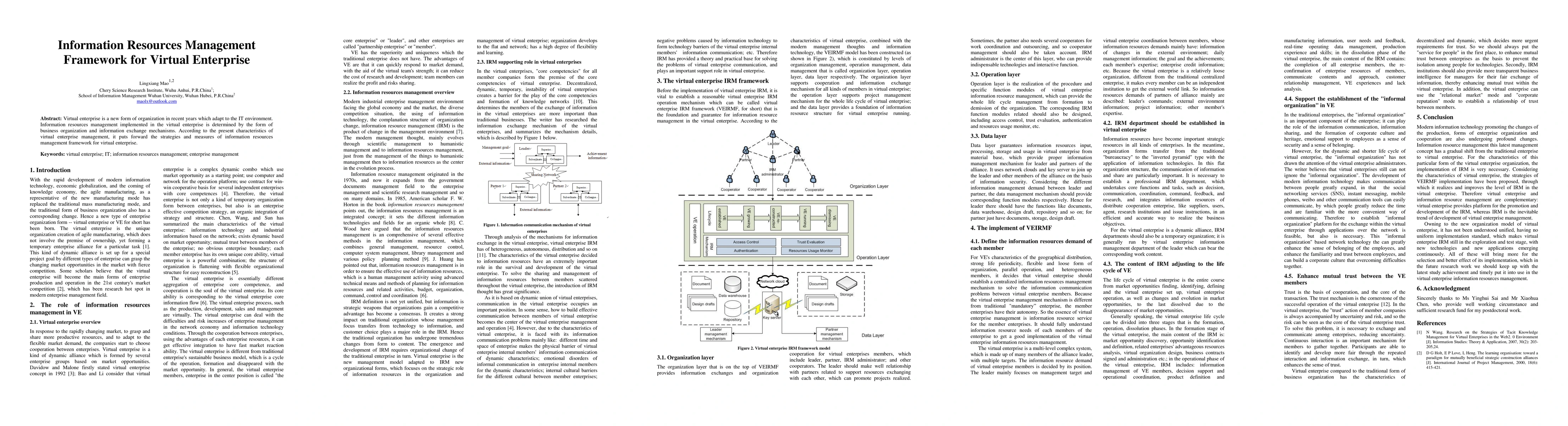 This paper proposes a framework for managing information resources in virtual enterprises, emphasizing the alignment of information management strategies with the organization's business structure and information exchange mechanisms. The study outlines specific strategies and measures tailored to the unique characteristics of virtual enterprise management.