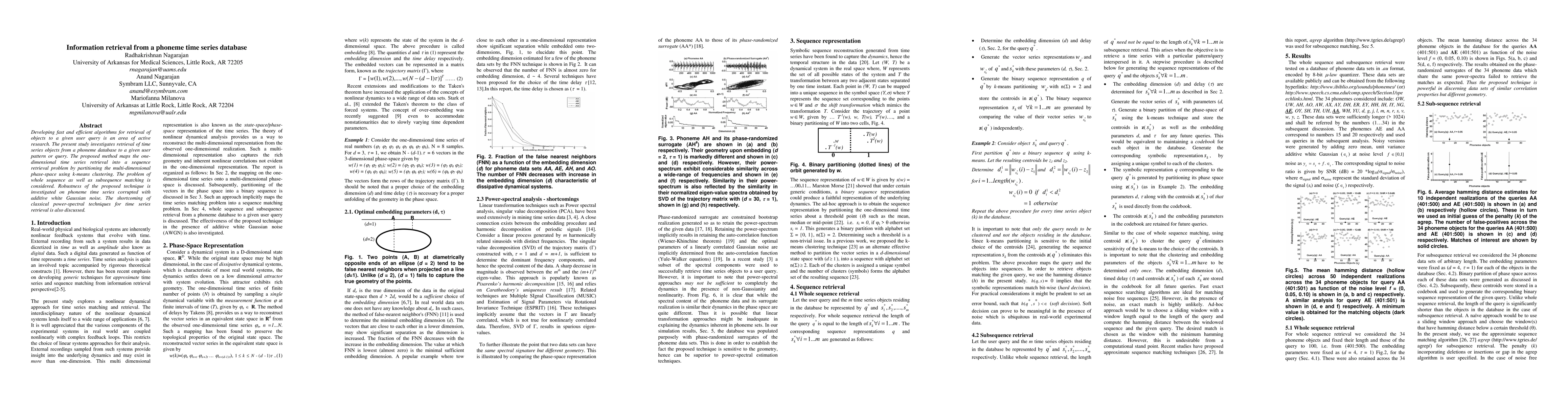 Developing fast and efficient algorithms for retrieval of objects to a given user query is an area of active research. The present study investigates retrieval of time series objects from a phoneme database to a given user pattern or query. The proposed method maps the one-dimensional time series retrieval into a sequence retrieval problem by partitioning the multi-dimensional phase-space using k-means clustering. The problem of whole sequence as well as subsequence matching is considered. Robustness of the proposed technique is investigated on phoneme time series corrupted with additive white Gaussian noise. The shortcoming of classical power-spectral techniques for time series retrieval is also discussed.