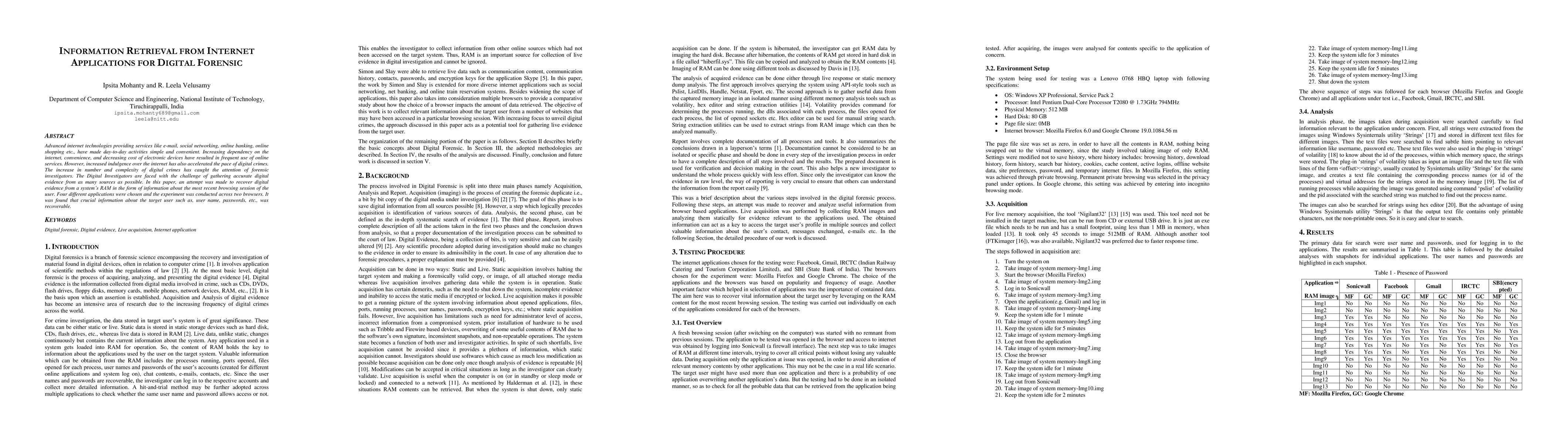 This paper explores the recovery of digital evidence from a system's RAM to investigate recent browsing sessions, focusing on four applications across two browsers. It demonstrates the feasibility of retrieving crucial user information, including usernames and passwords, highlighting the challenges and opportunities in digital forensic investigations.
